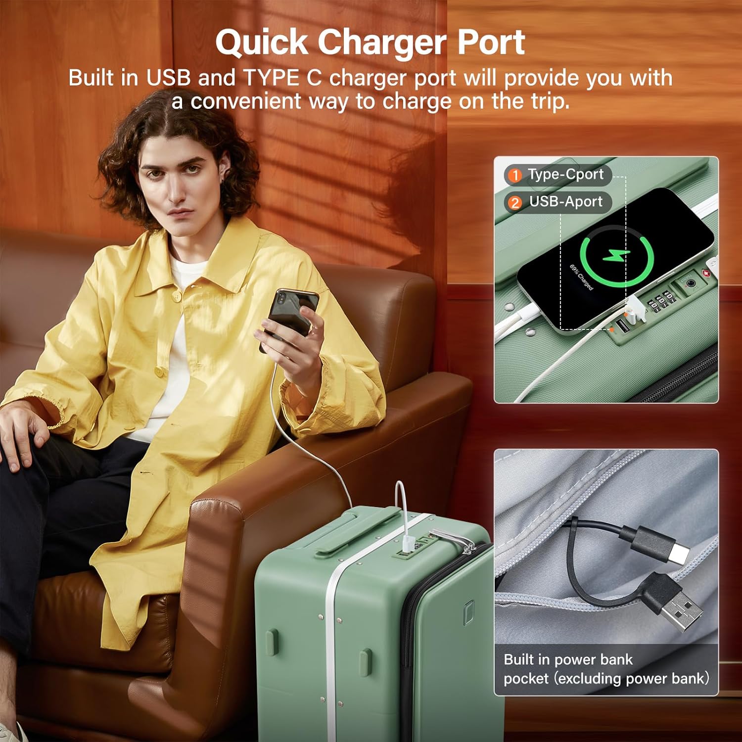 - 【Quick Charger Port】This large luggage with charger built in USB and TYPE C charger port,you only need to connect the power bank to the cable in the pocket inside and the travel suitcase will provide you with a more convenient way to charge your electronic devices on the trip.