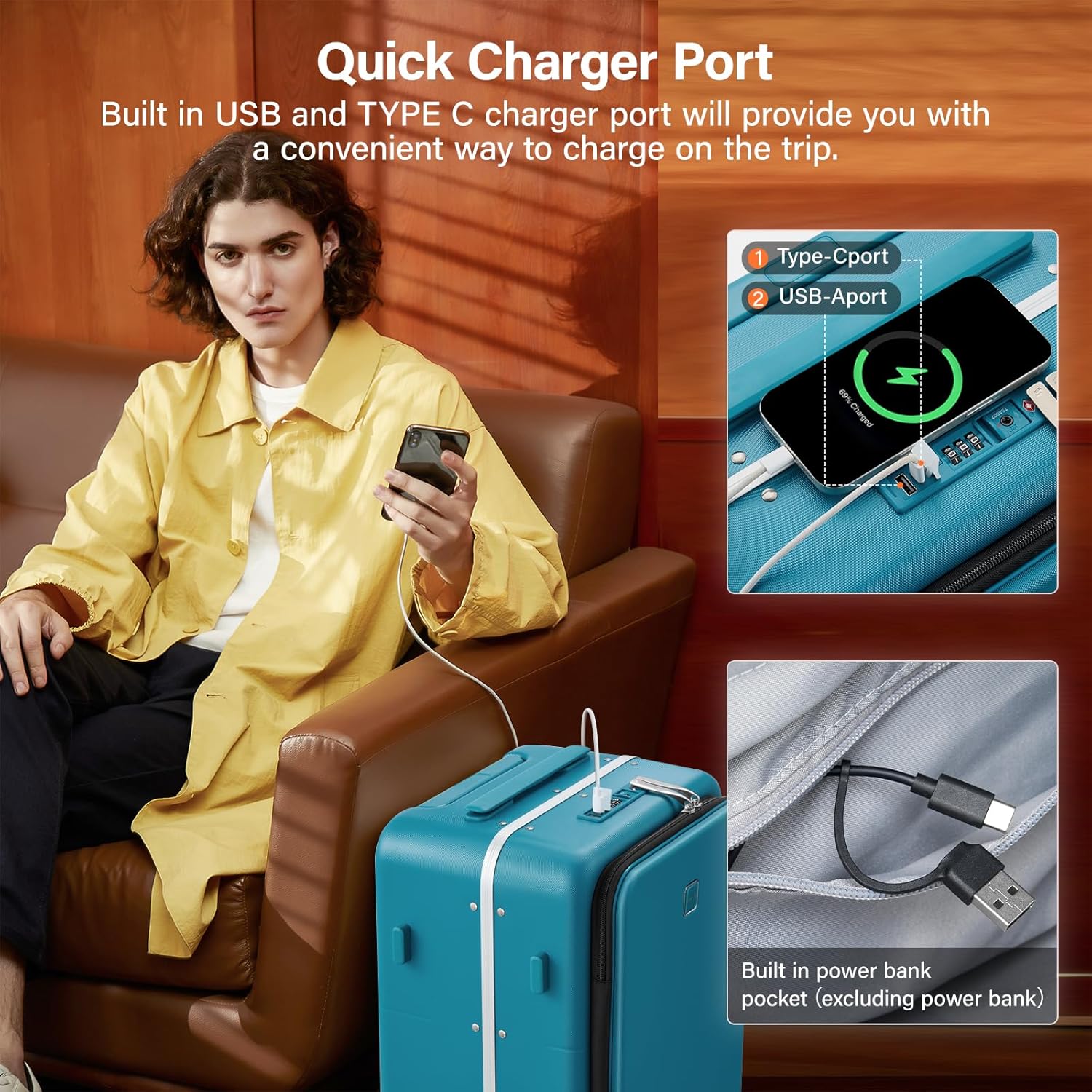 - 【Quick Charger Port】This large luggage with charger built in USB and TYPE C charger port,you only need to connect the power bank to the cable in the pocket inside and the travel suitcase will provide you with a more convenient way to charge your electronic devices on the trip.