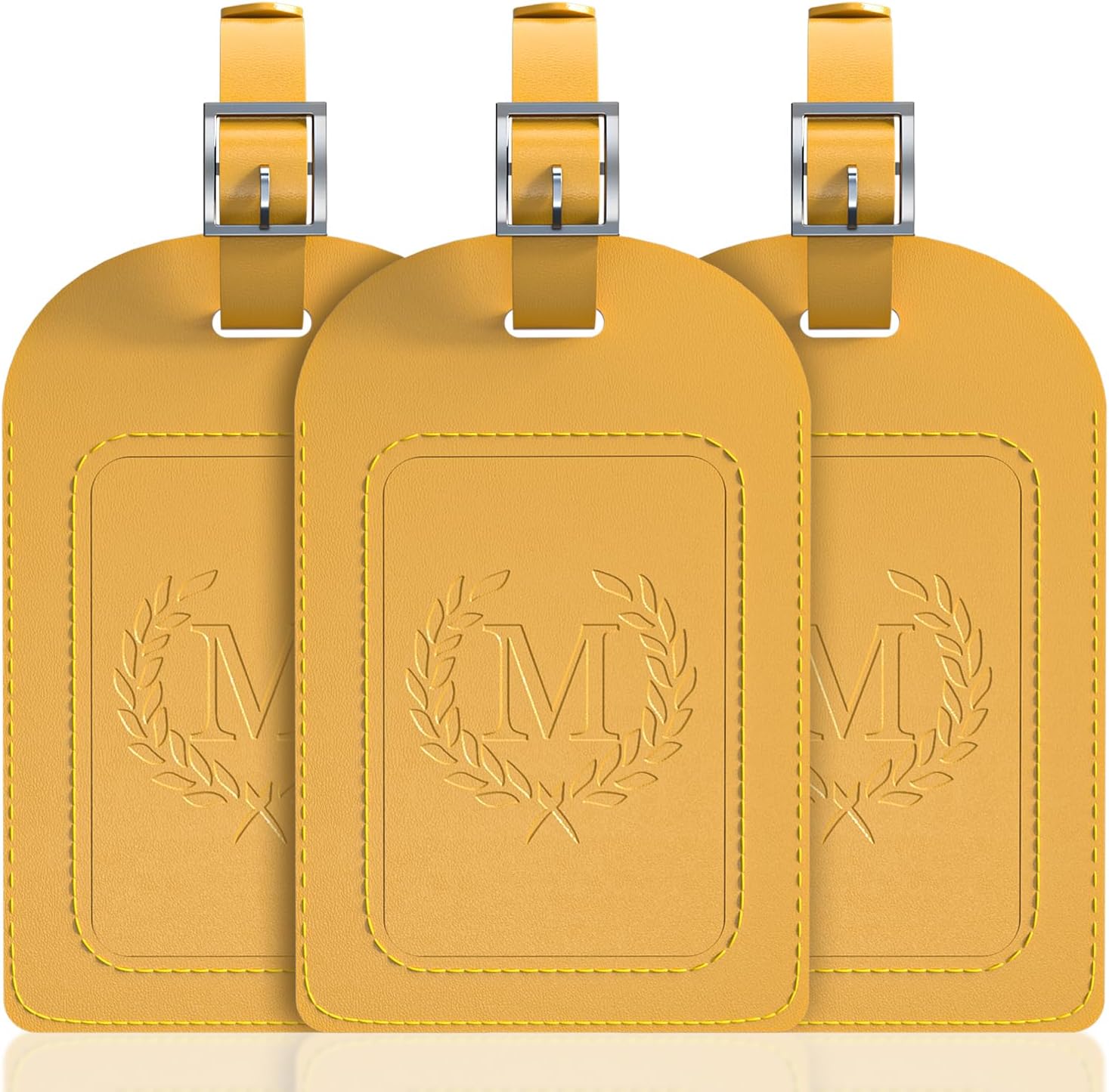 FESAS 3 Pack A-Z Alphabet Luggage Tags - Faux Leather Suitcase Tags with Privacy Cover & Replaceable Card - Initial Letter Monogram for Bags (Yellow)