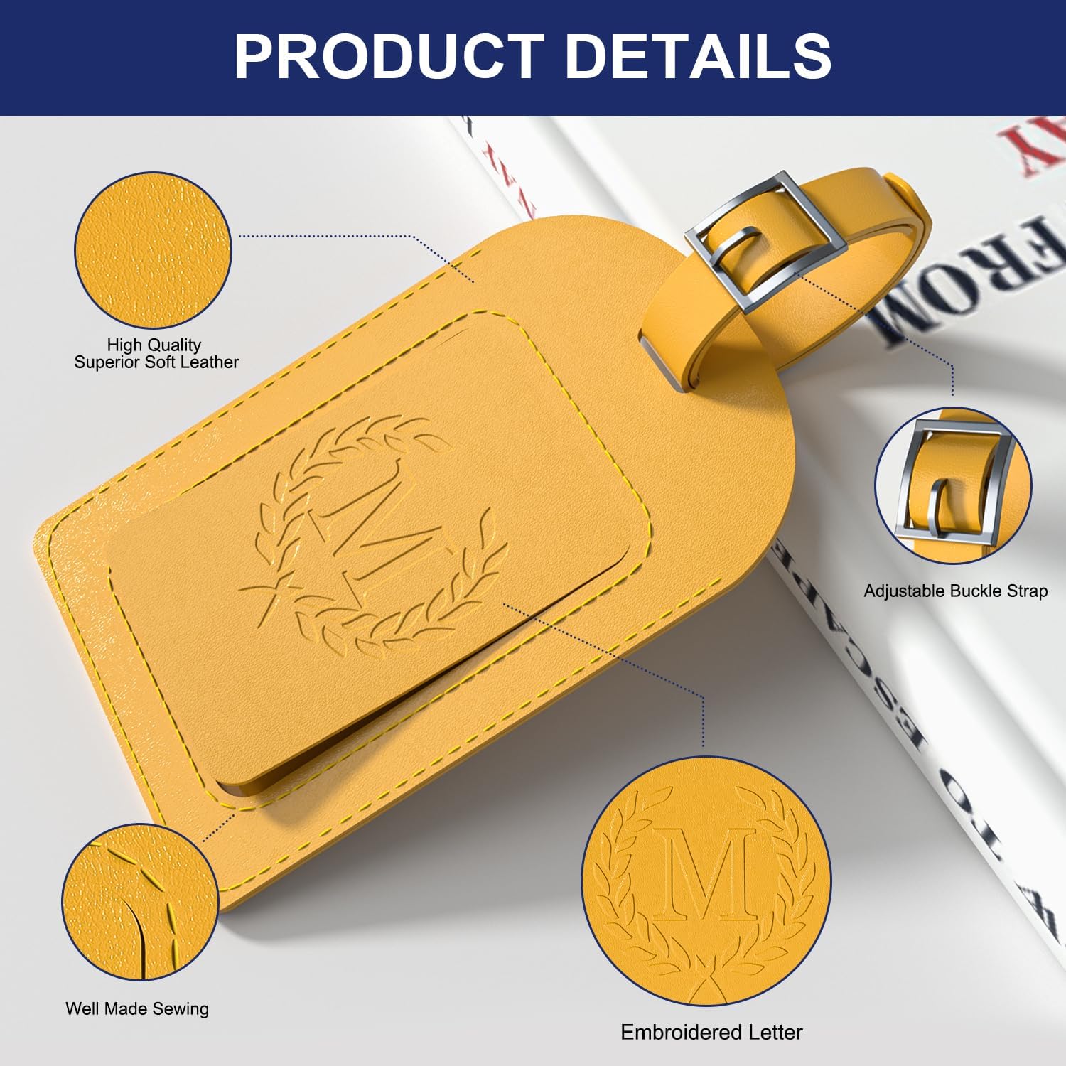 FESAS 3 Pack A-Z Alphabet Luggage Tags - Faux Leather Suitcase Tags with Privacy Cover & Replaceable Card - Initial Letter Monogram for Bags (Yellow)