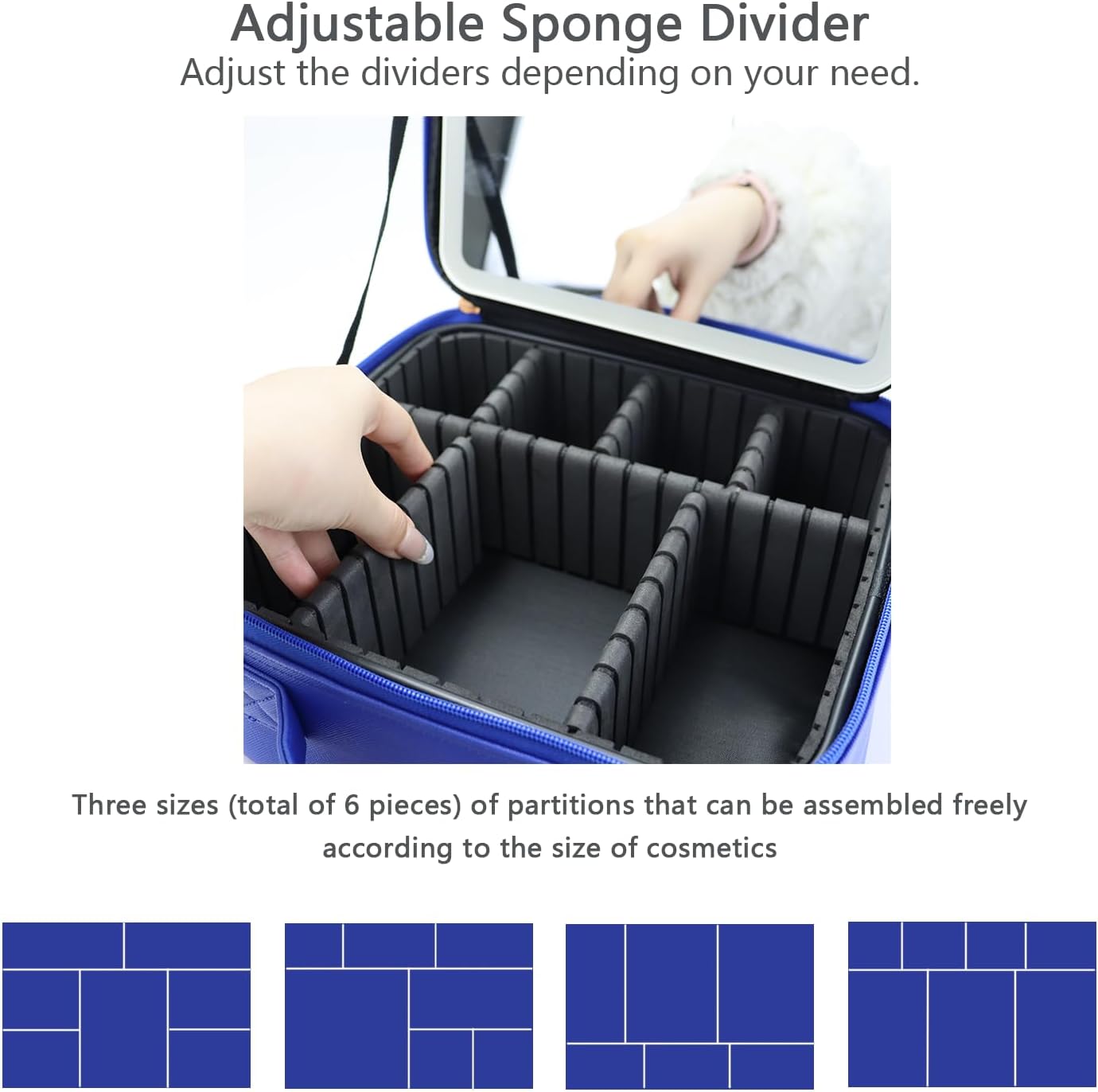 Makeup Bag with Led Mirror,Travel Makeup Organizer with 3 Color Setting & 10X Magnifying Mirror, Portable Storage and Adjustable Dividers Travel Makeup Bag-dark blue
