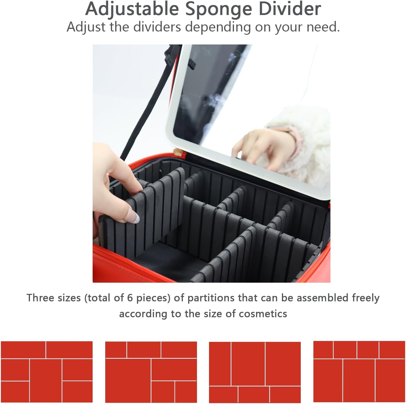 Makeup Bag with Led Mirror,Travel Makeup Organizer with 3 Color Setting & 10X Magnifying Mirror, Portable Storage and Adjustable Dividers Travel Makeup Bag-red