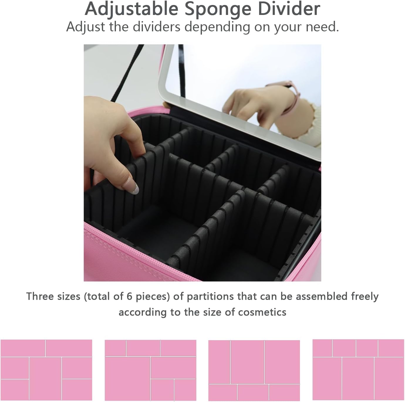 Makeup Bag with Led Mirror,Travel Makeup Organizer with 3 Color Setting & 10X Magnifying Mirror, Portable Storage and Adjustable Dividers Travel Makeup Bag-Dark Pink