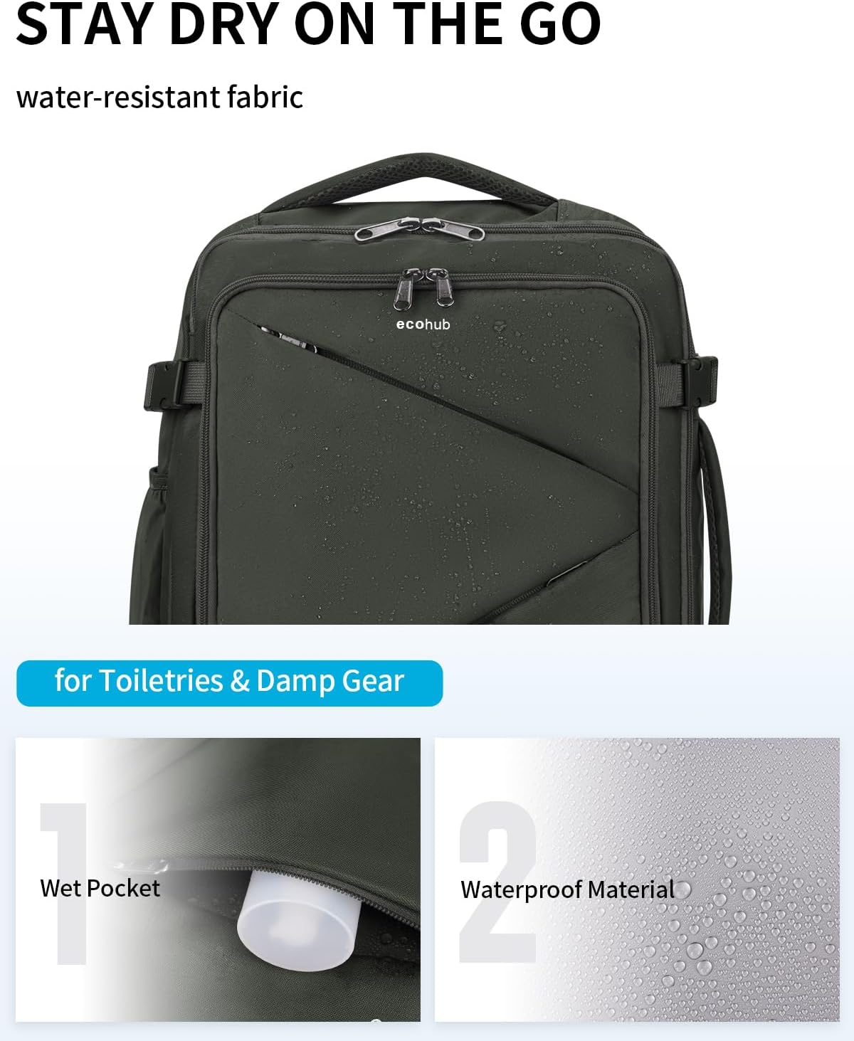 ECOHUB 30L Carry on Travel Backpack for Men Women 18x14x8, 17 inch Expandable Airlines Personal Item Bag Water Resistant Laptop Backpack Flight Approved with USB Slot & Wet Pocket, Green