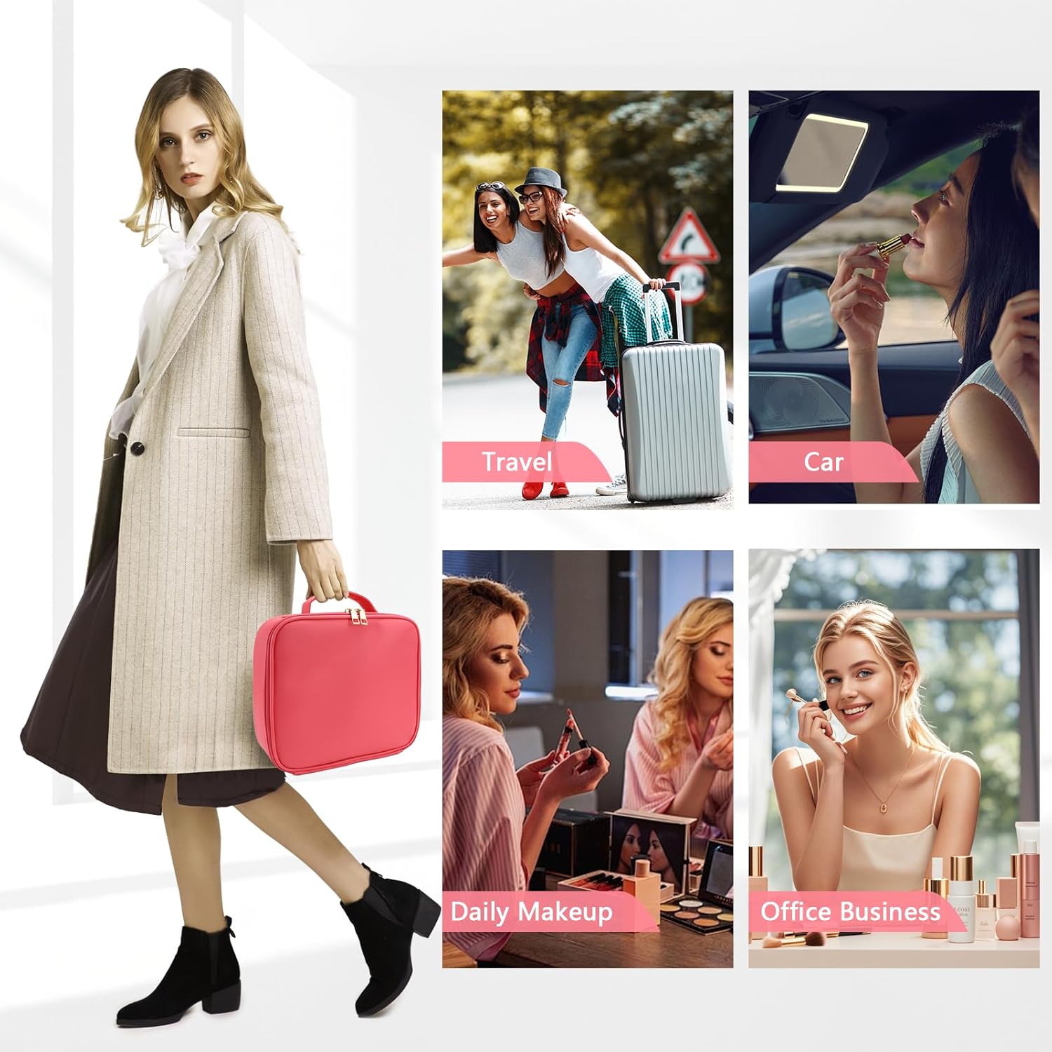 Travel Makeup Bag for Makeup Artists Large Makeup Case,with Mirror 3 Color Setting and Detachable 10x Magnifying Mirror Travel Makeup Bag,Portable Storage and Adjustable Dividers(light red)
