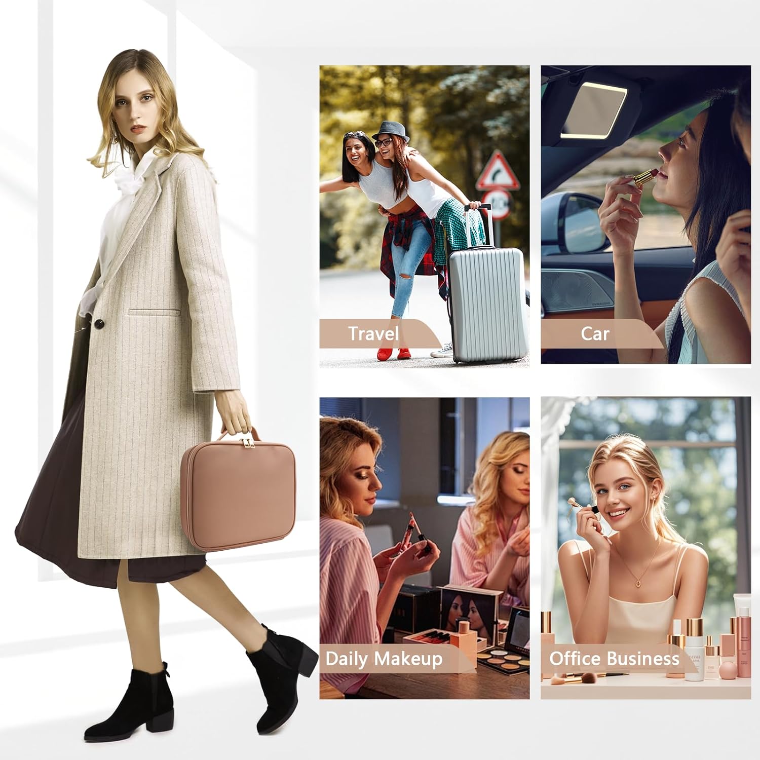 - Walking Powder Room:The travel makeup bag with led mirror is 10.4"x 9.1"x 4.6" and can hold most sizes and shapes of beauty makeup accessories, Portable and lightweight design to meet your needs anytime, anywhere.It also fits perfectly in a suitcase.