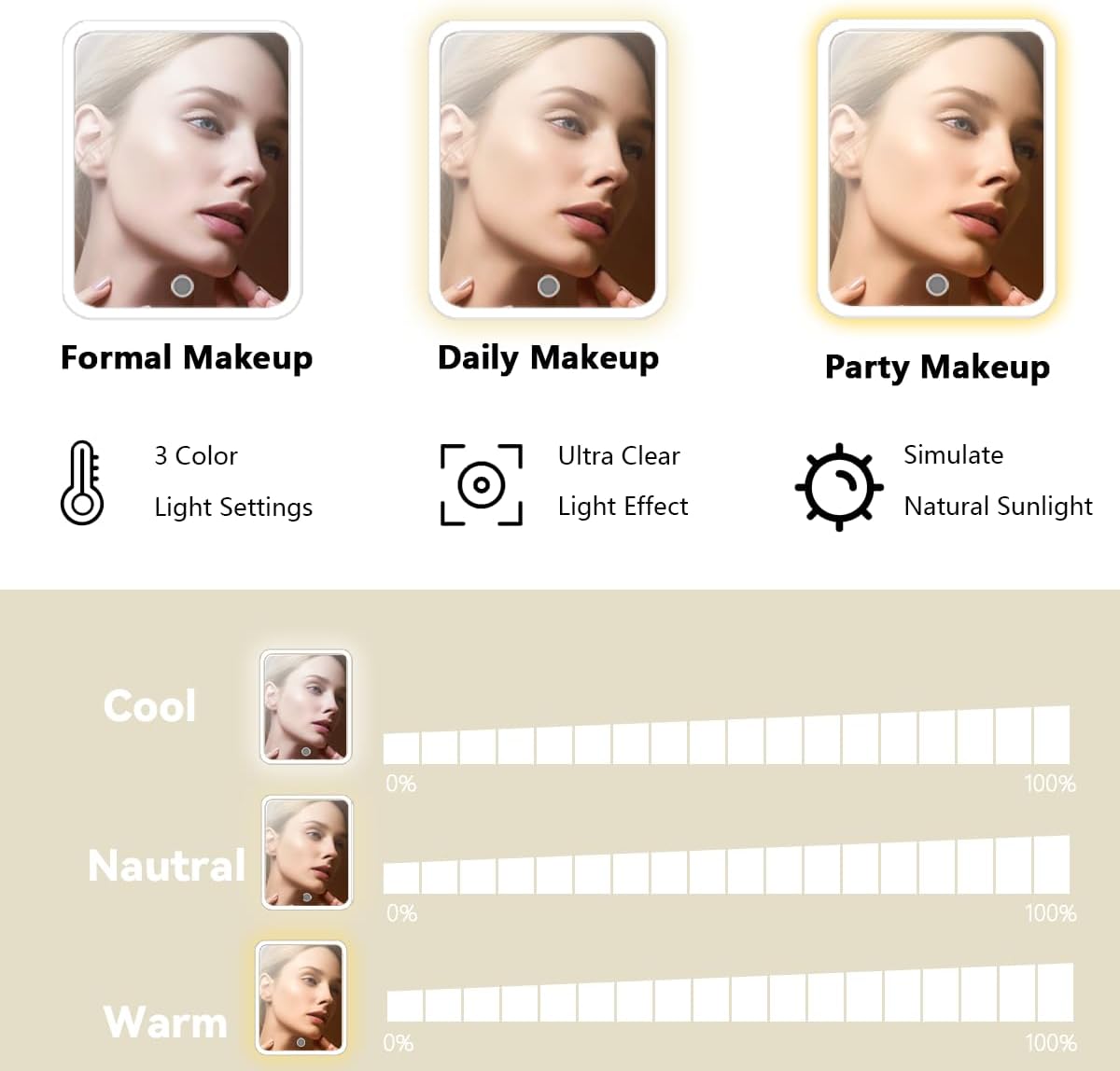 - Removable & Adjustable Brightness High Definition LED mirror:the travel makeup bag with vanity mirror of led light 3 color setting and 10x Magnifying Mirror. and 0-100% adjustable brightness that can be switched. With a long press on the switch, and a short press can adjust the color temperature between cool, natural and warm light.can be disassembled for separate use, and the makeup mirror comes with a separate stand that can be conveniently placed on the table according to your needs.