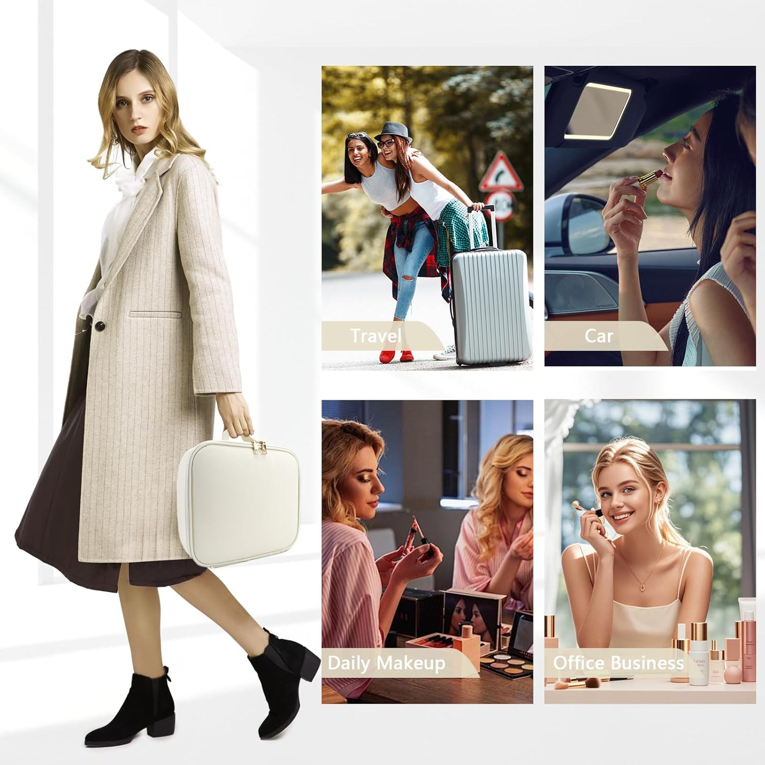 Travel Makeup Bag for Makeup Artists Large Makeup Case,with Mirror 3 Color Setting and Detachable 10x Magnifying Mirror Travel Makeup Bag,Portable Storage and Adjustable Dividers(white)