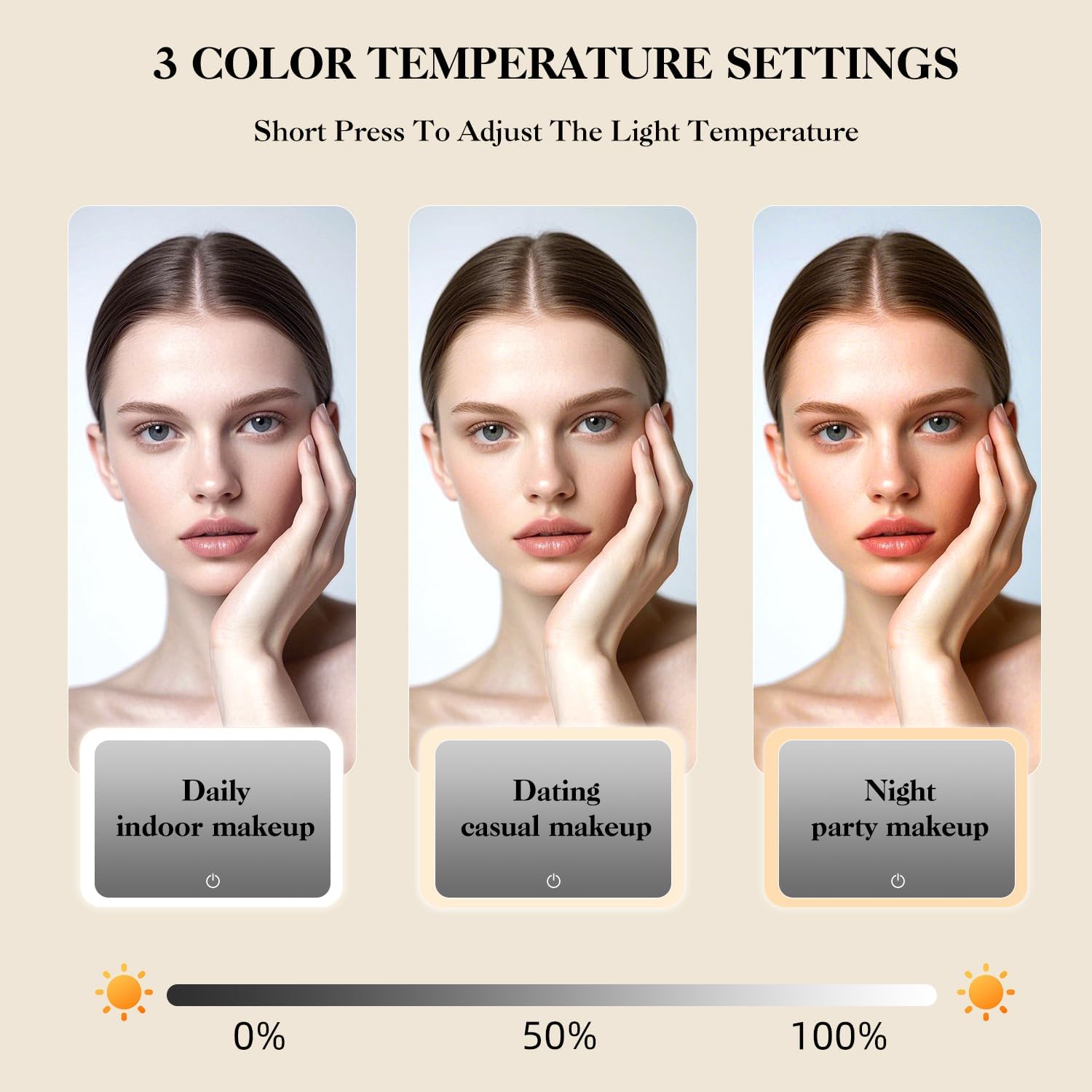 - 3-color Adjustable Light with Makeup Mirror:Simply press the switch to easily adjust the color temperature and switch between cool light, natural light, and warm light to meet the makeup needs of different occasions. Press and hold the switch to adjust the brightness of the light. Whether it's early morning or dusk, makeup bag with led mirror can create the perfect natural lighting effect to ensure that every makeup look is flawless