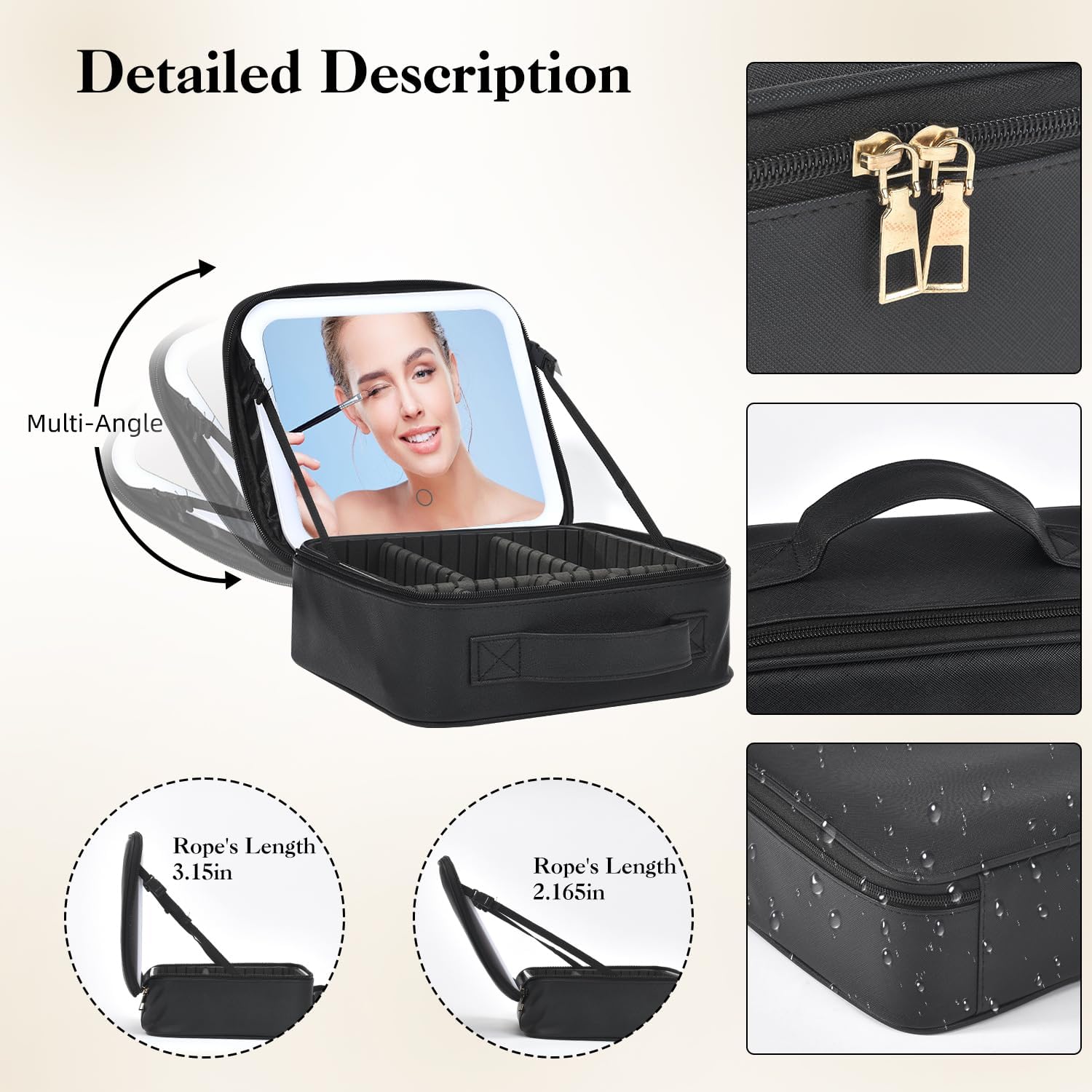 Travel Makeup Bag With LED Mirror,Cosmetic Train Case with 3 Color Setting,Cosmetic Makeup Organizer Bag with Adjustable Dividers,Portable Make up Box with Make up Brushes Holder Storage(Back)