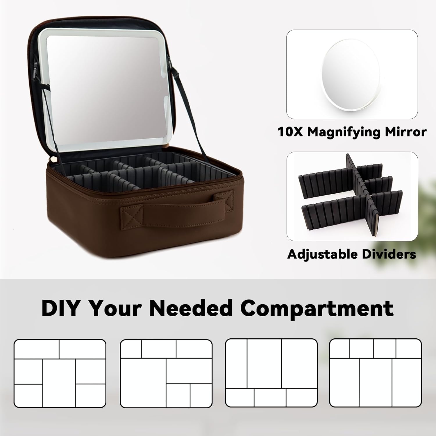 Travel Makeup Bag with LED Mirror and 10x magnifying glass with 3 Lighted Settings, Adjustable Dividers and Makeup Brush Storage Bag Mocha