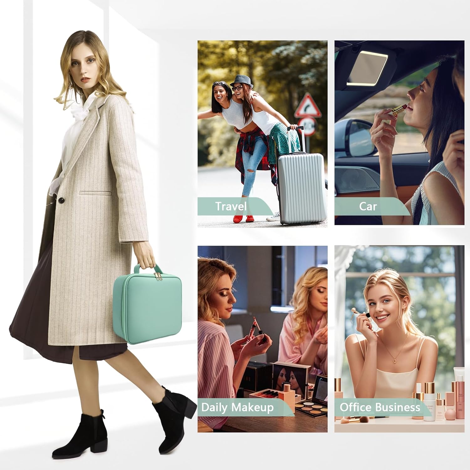 Travel Makeup Bag,with Mirror 3 Color Setting and Detachable 10x Magnifying Mirror Travel Makeup Bag,Portable Storage and Adjustable Dividers (light green)
