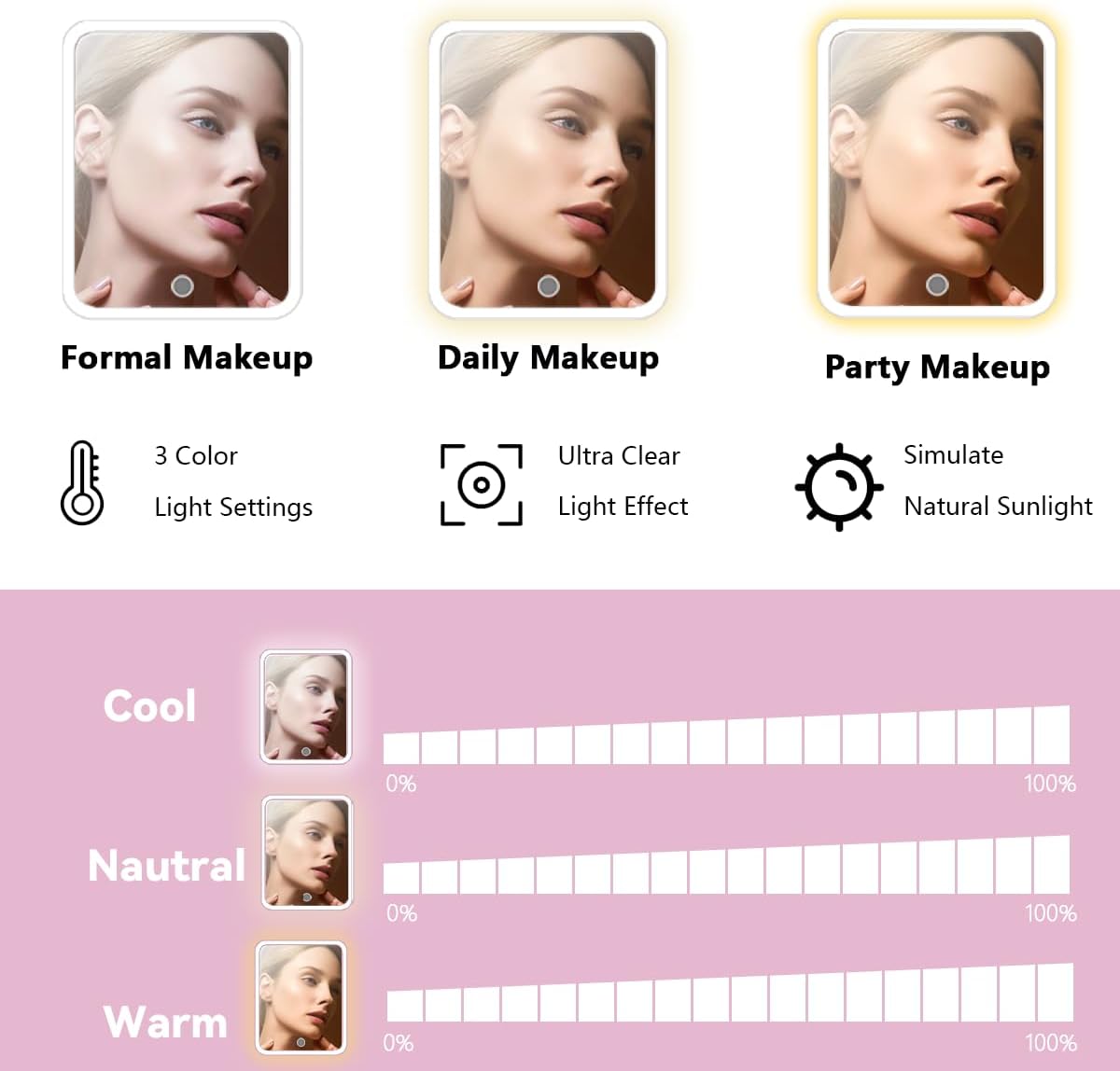 - Removable & Adjustable Brightness High Definition LED mirror:the travel makeup bag with vanity mirror of led light 3 color setting and 10x Magnifying Mirror. and 0-100% adjustable brightness that can be switched. With a long press on the switch, and a short press can adjust the color temperature between cool, natural and warm light.can be disassembled for separate use, and the makeup mirror comes with a separate stand that can be conveniently placed on the table according to your needs.