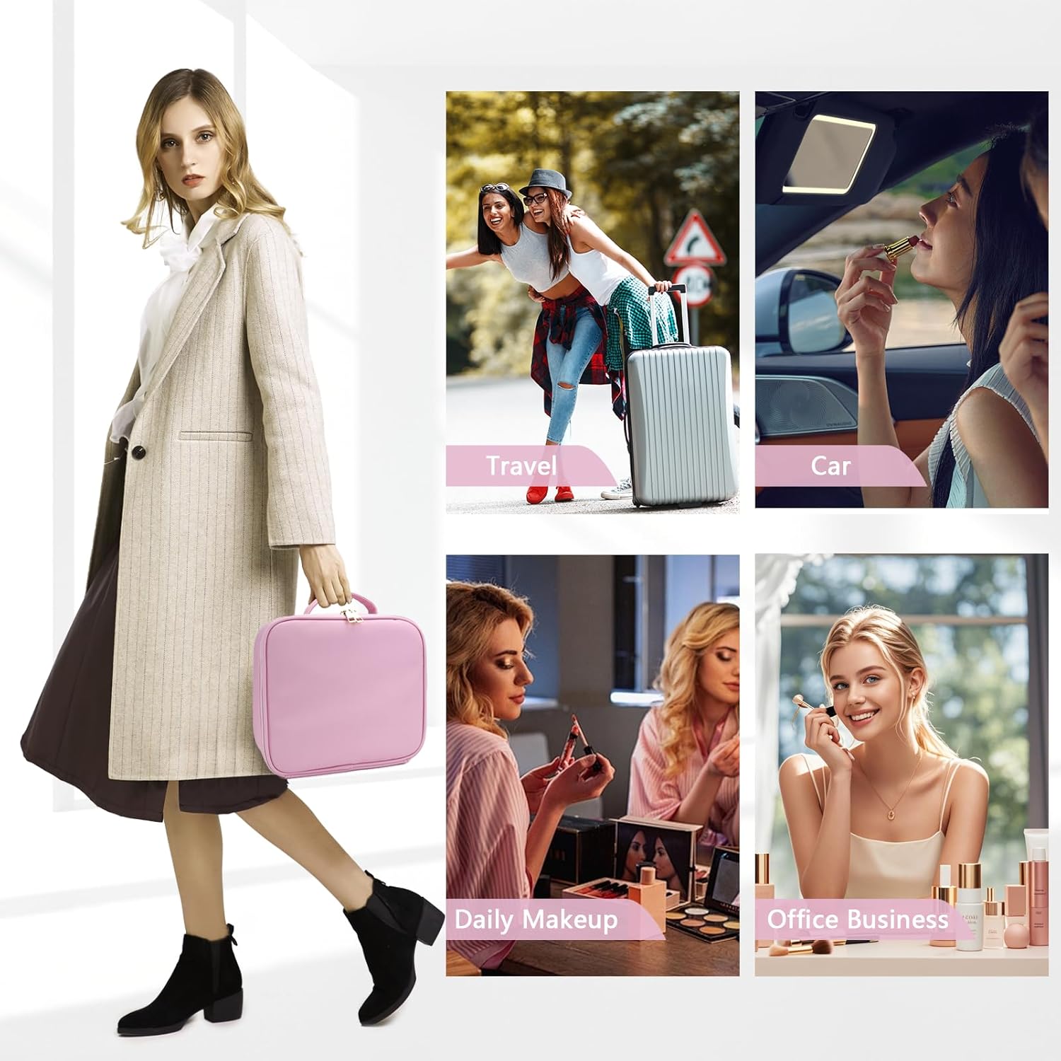 Travel Makeup Bag,with Mirror 3 Color Setting and Detachable 10x Magnifying Mirror Travel Makeup Bag,Portable Storage and Adjustable Dividers(Light Pink)
