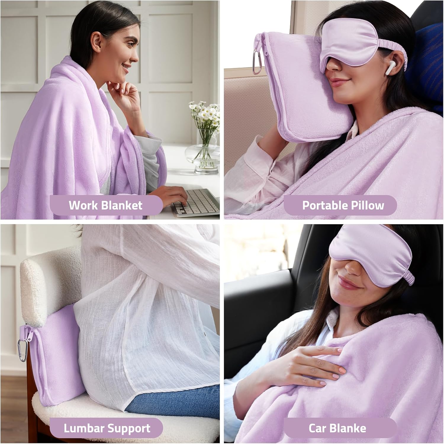 Travel Blanket, 3-in-1 Ultra-Soft, Warm & Lightweight Travel Blanket Airplane with Bag, 65x40 in, Airplane Travel Essentials for Women, Men & Kids with Eye Mask, Luggage Sleeve & Backpack Clip