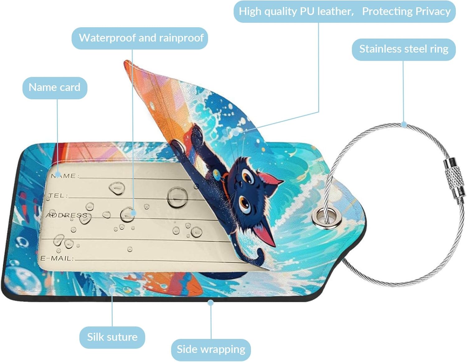 Fun Luggage Tags for Suitcases Leather Name Tag for Luggage Cute Travel Baggage Tags for Carnival Cruise Ships with Funny Patter 2pcs (Surf Cat)