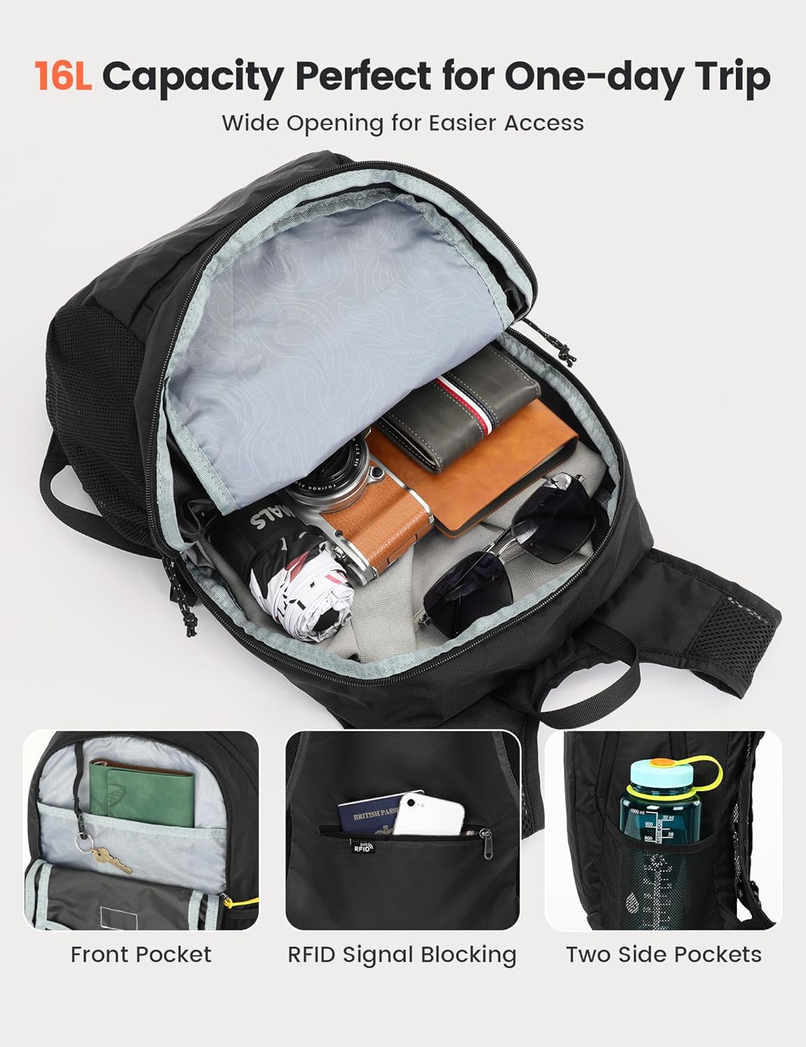 SKYSPER 16L Hiking Backpack Lightweight Small for Women Men, Foldable Packable Daypack - Travel Camping Backpack, Outdoor Hiking Bag (Black)