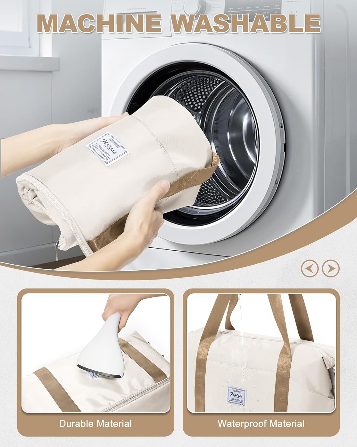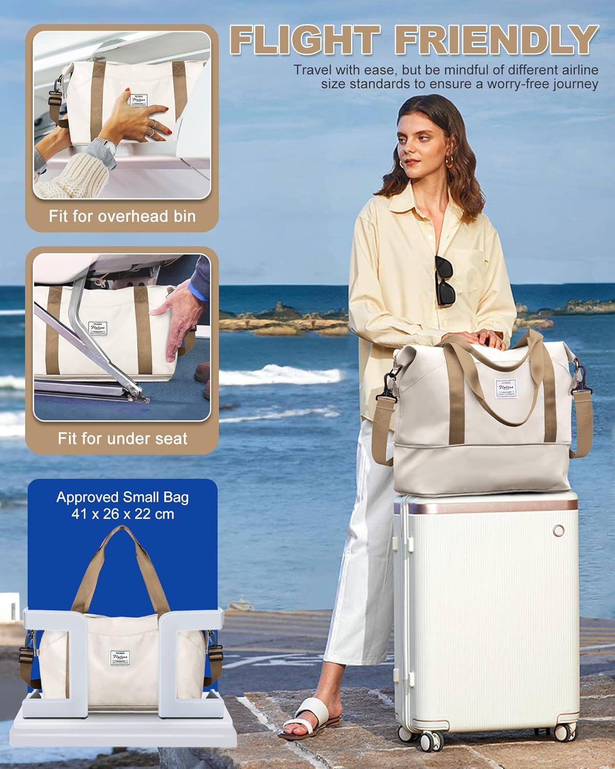- 【High Capacity Travel Bag】Travel Bag has three multiple internal and four external organizational pockets,which ensure you placed more scientifically and orderly.The overnight bag for women has Large Capacity.Ordinary size :41*26*22CM,Expansion Dimension:41*37*22CM.You can carry it onto an airplane. Large storage space for a clothes for short trip.It has a capacity of 35L and can hold 6 to 8 pieces of summer clothes,Cosmetics,toiletries,wallets,keys,earphones,mobile power,mobile phones,files.