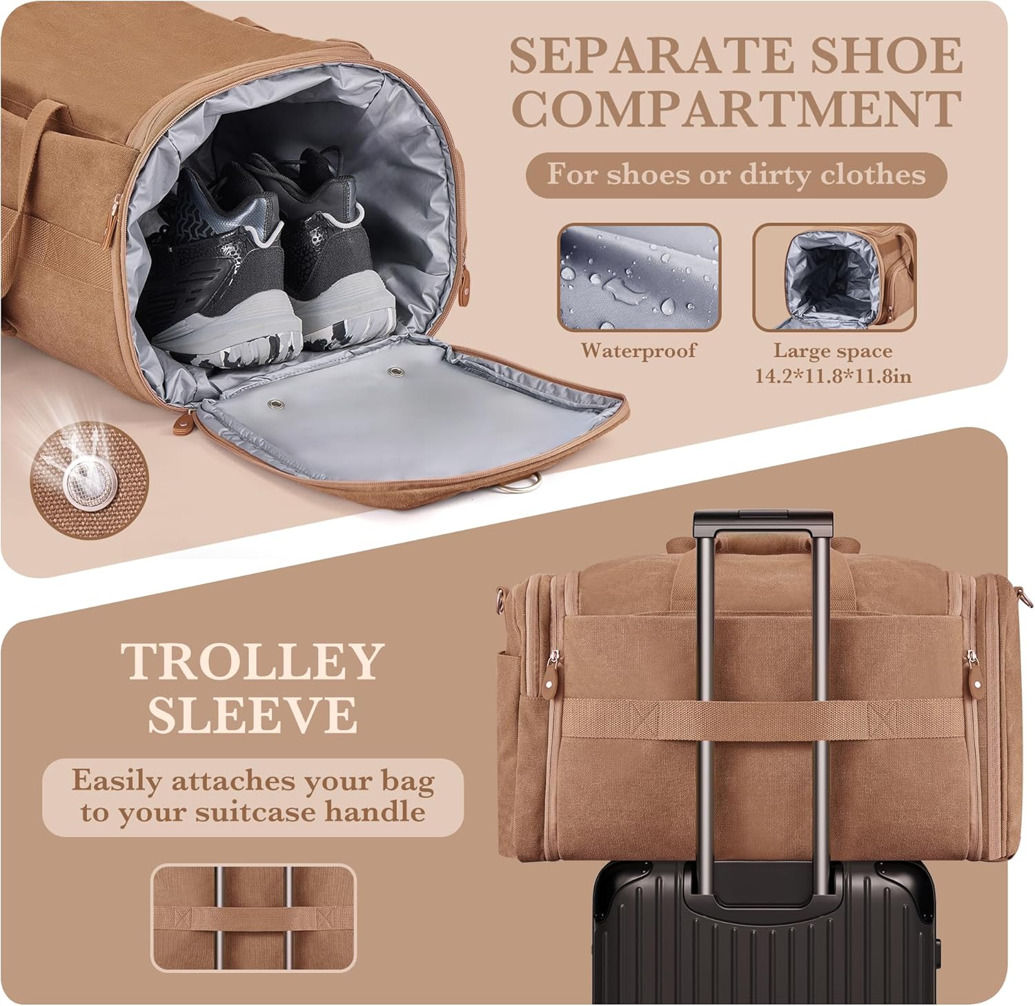 SHOWKOO Duffle Bag for Travel 60L Expandable Canvas Travel Bag Durable Vintage Weekender Overnight Carry On Bag for Men(Khaki)