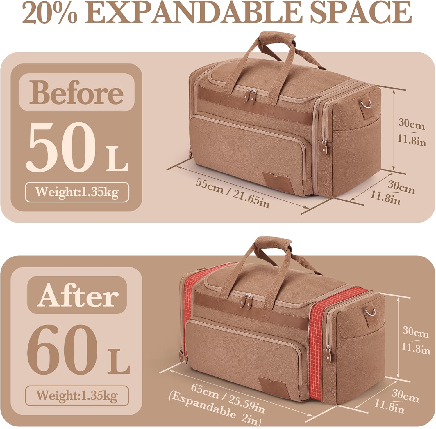 - EXPANDABLE FUNCTION: Canvas travel duffel bag with expandable function, regular size is (L) 21.65 x (W) 11.81 x (H) 11.81 inches. The side zipper can be opened to expand the size of (L) 25.59 x (W) 11.81 x (H) 11.81 inches. The capacity of the travel bag can be expanded from 50L to 60L,you can easily load more luggage when returning from a trip!