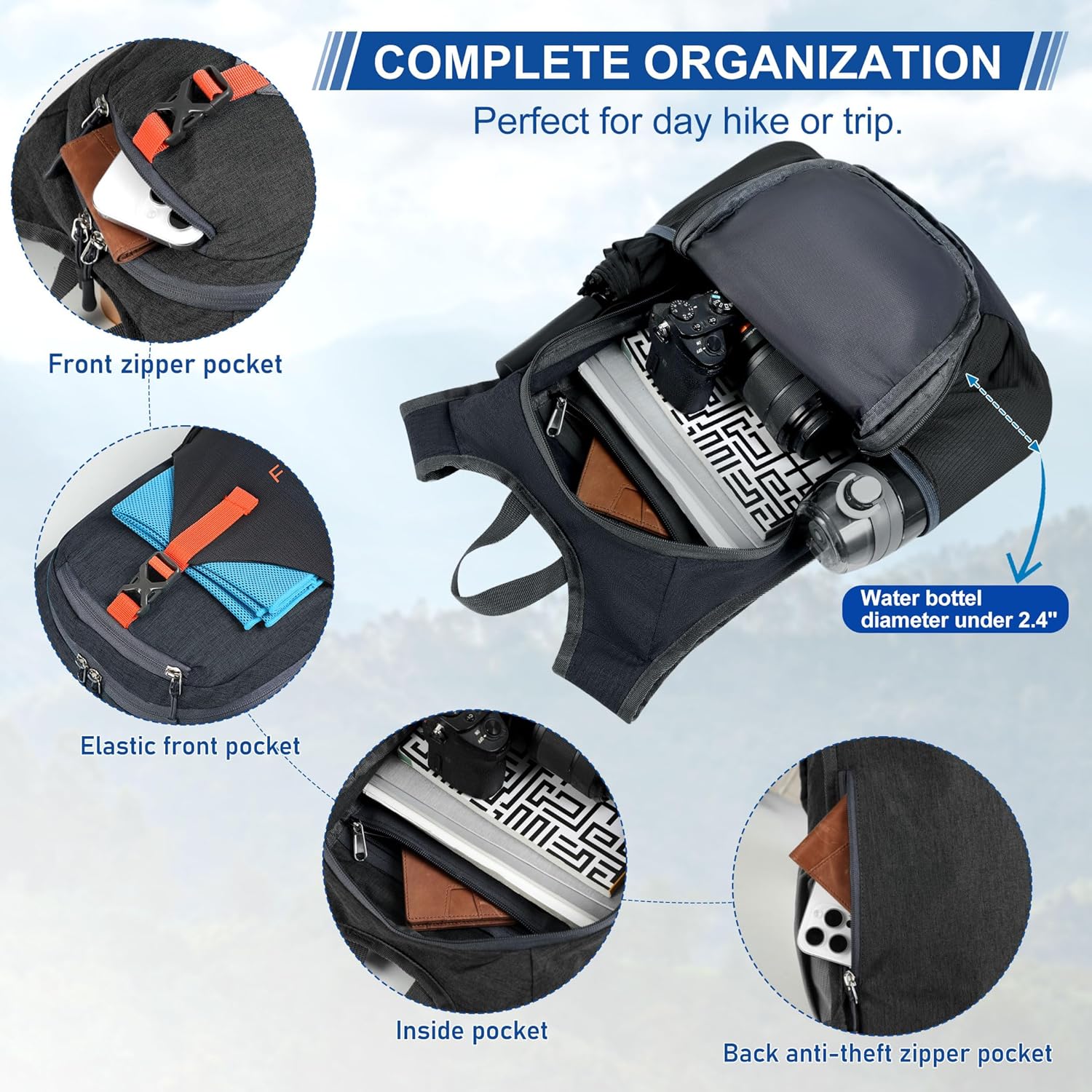 - Smart Storage Compartments: Three spacious main compartments, two mesh side pockets (fits 3.9'' diameter bottles), and a hidden anti-theft rear pocket keep gear neatly sorted. Securely store wallets in the back, stash snacks in the front, and use the elastic-lined pockets for quick-dry towels or sunscreen. Perfect for camping weekends, gym sessions, hiking bag, or as a carry-on personal item.
