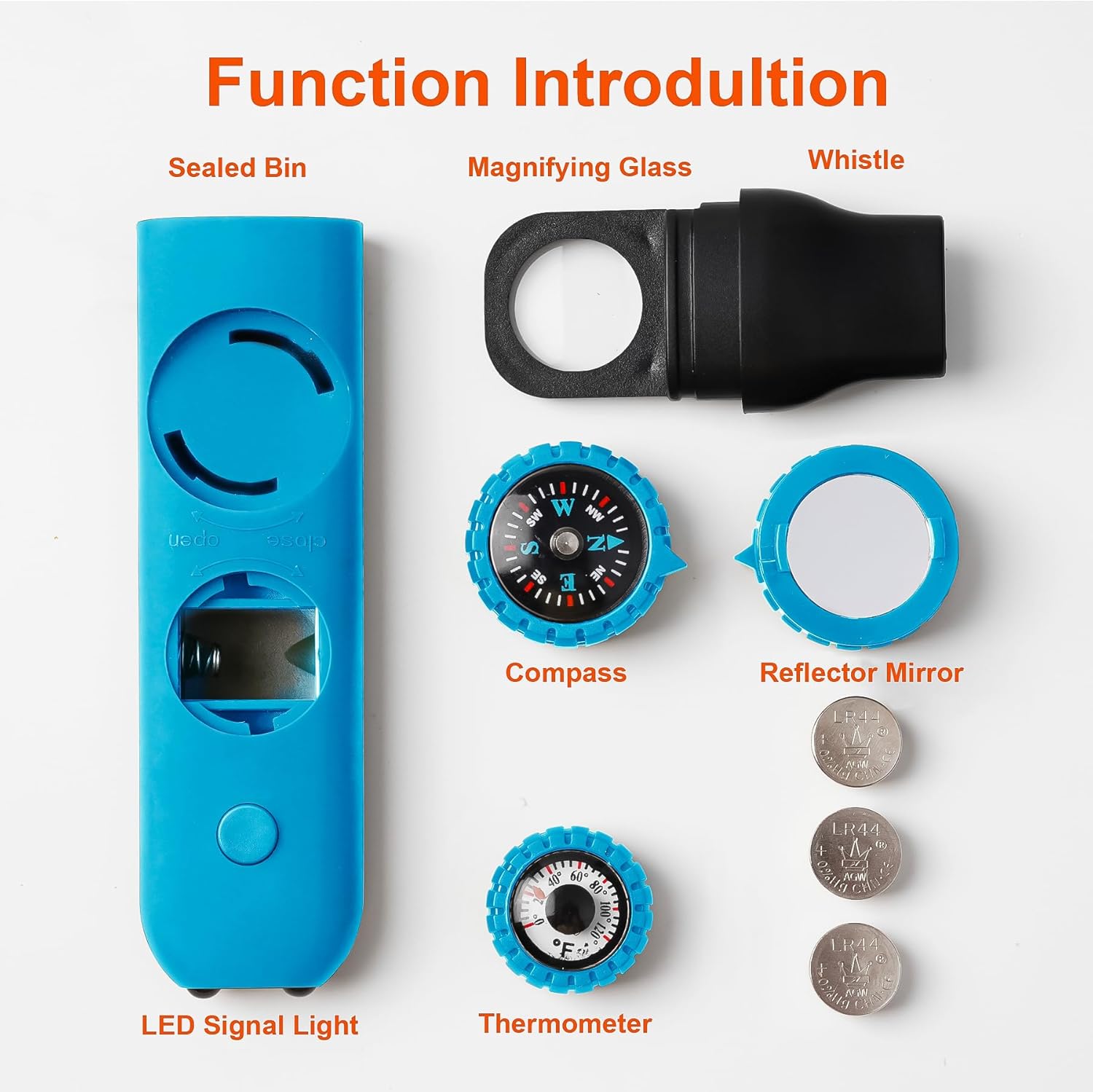 - The 7-in-1 Safety Whistle sets 7 functions including Emergency Whistle, Compass, Thermometer, LED Signal Light, Magnifying Glass, Reflector and Sealed Warehouse with good playability (The uniquely designed miniature built-in storage bin can be used to store important personal information, allowing rescuers to grasp your situation at the first time) (NOTE: If you need help in an emergency, you can try whistling softly, which is louder than whistling at full force)