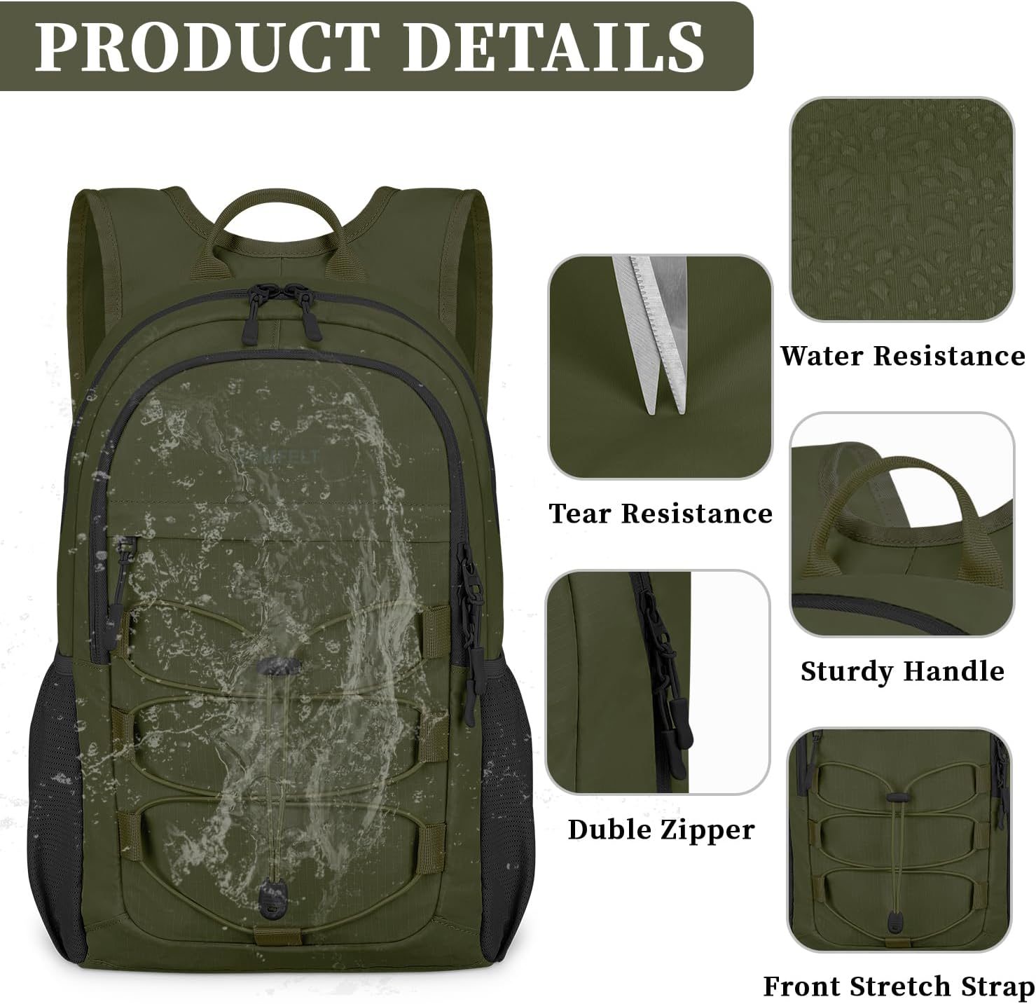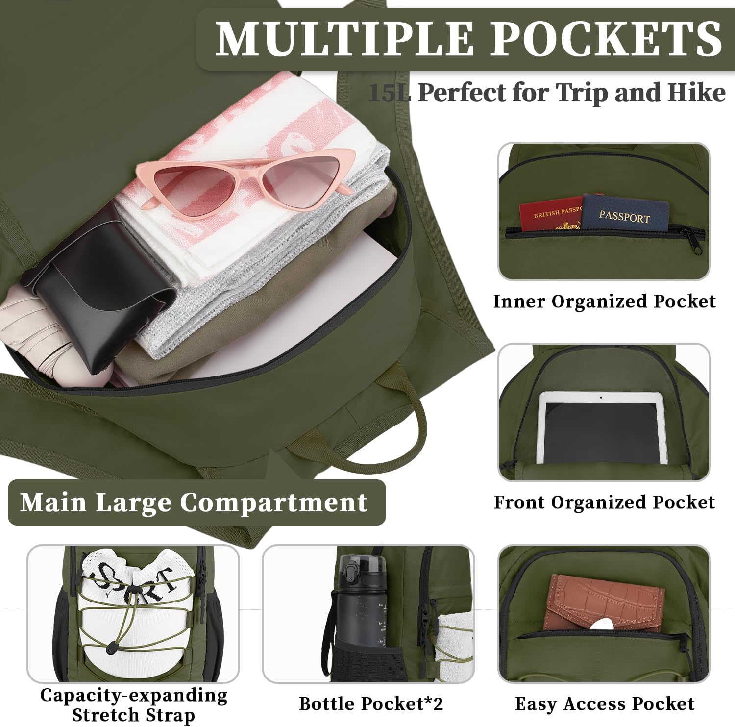 - Compact Yet Spacious: This hiking backpack for women combines minimal size with maximum practicality. The 15l main compartment and zippered interior pocket can hold your travel and hiking essentials. Two quick-access front zippered pockets hold your phone, portable charger and more. Two side pockets can easily accommodate large water bottles and umbrellas. An elastic drawstring stores items such as hats or sports protective gear