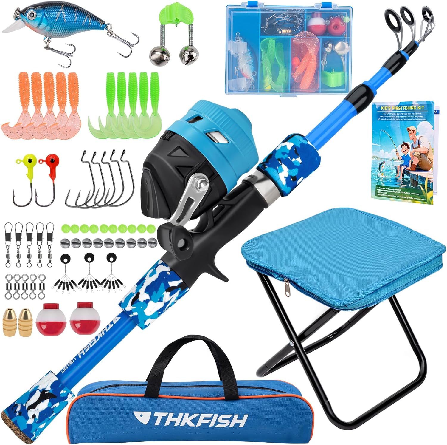 - Full Kids Fishing Kit: This all-in-one fishing pole kit features a convenient telescopic rod, a tangle-free reel (pre-spooled & ready to use!), a tackle box packed with essential lures and accessories, a folding stool, and a portable carry bag that neatly holds all the gear. Designed for kids to be safe, easy to use, and fun, give your young angler everything they need for exciting fishing adventures!