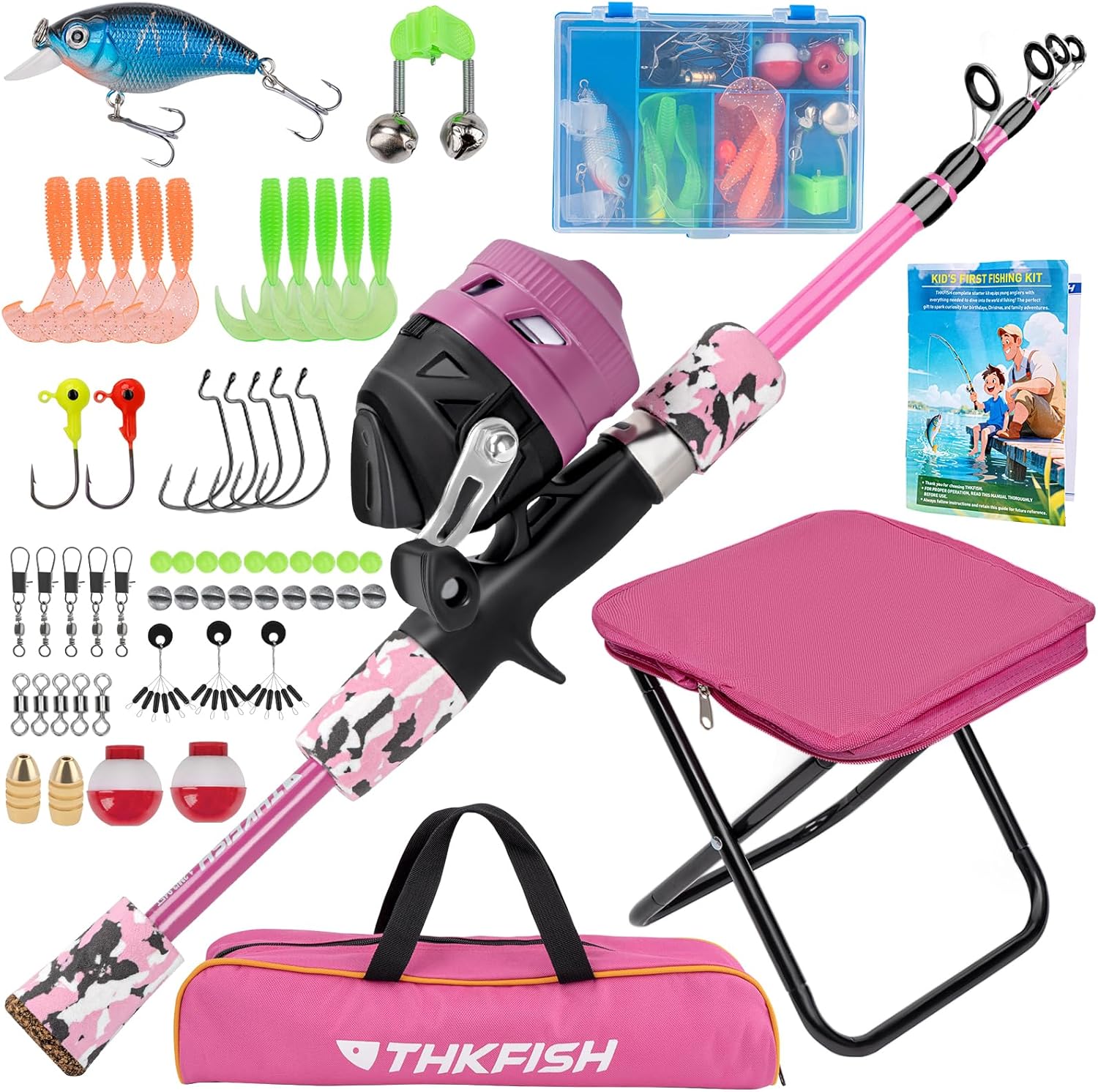- Full Kids Fishing Kit: This all-in-one fishing pole kit features a convenient telescopic rod, a tangle-free reel (pre-spooled & ready to use!), a tackle box packed with essential lures and accessories, a folding stool, and a portable carry bag that neatly holds all the gear. Designed for kids to be safe, easy to use, and fun, give your young angler everything they need for exciting fishing adventures!