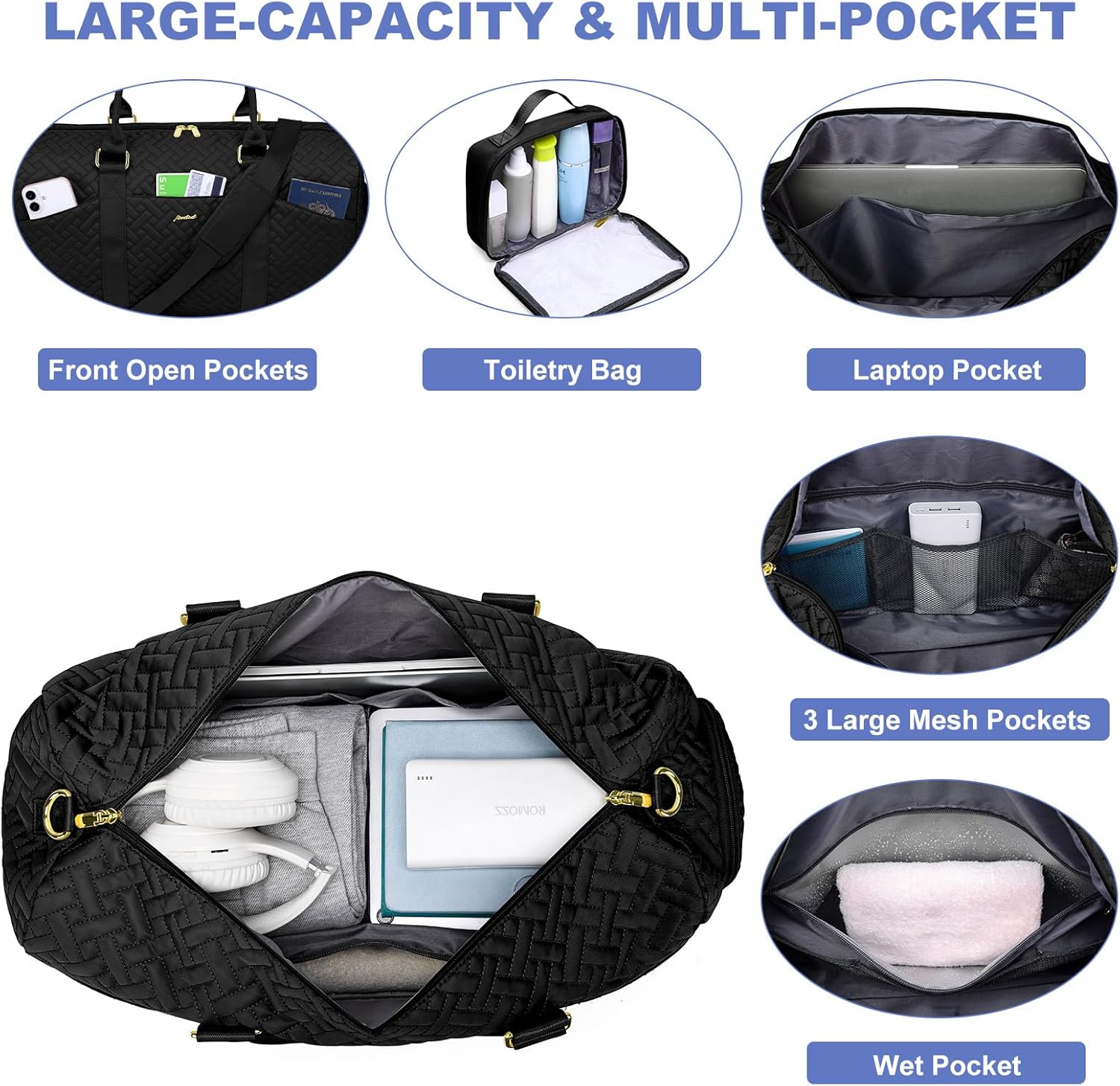 - FREE TOILETRY BAG + SEPARATED WET AND DRY GYM BAG HOSPITAL BAG - The carry on duffel bag comes with 1 toiletry bag to store your cosmetics/toiletries. Also overnight bags for women have a waterproof PVC lined pocket that separates wet and dry items like clothes, towels and swimsuits. Black duffel bag is the perfect companion for outdoor and indoor sports like workouts, yoga, camping, beach etc. If you're a novice mother, it can also be used as a mom hospital bag, maternity bag or diaper bag.