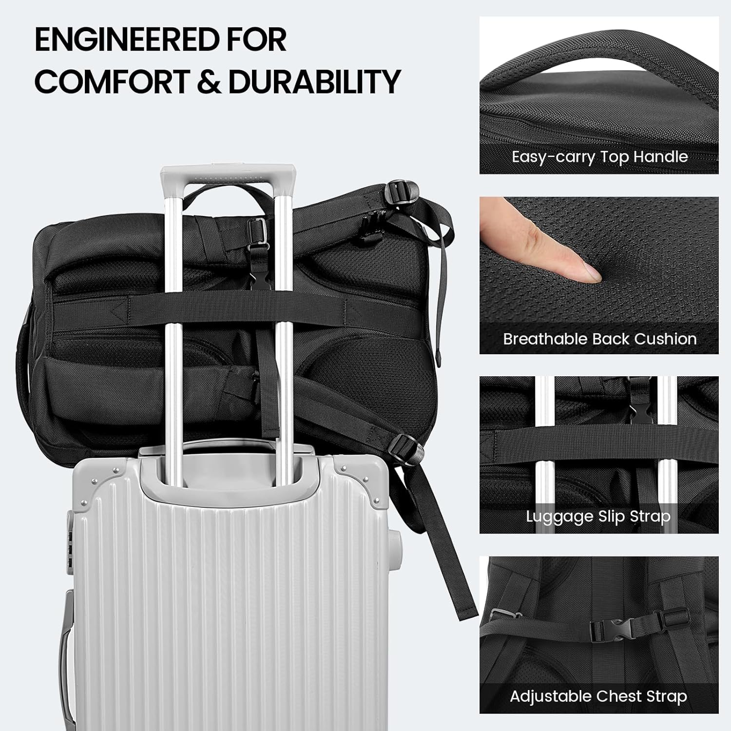 - Durable and long lasting using: Backpack luggage for travel Made of High quality YKK zippers and durable tear-resistant waterproof polyester fabric. A breathable back panel and ergonomically designed, contoured, padded shoulder straps provide comfort, and an adjustable chest buckle helps shift weight away from the shoulders. Luggage straps on the back of the carry on bag provide more flexibility, Conveniently portable