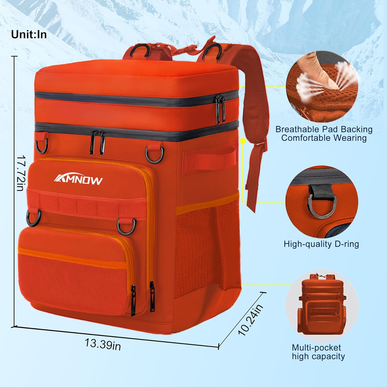 - Large Capacity & Multi-Pocket Design Cooler: AMNOW insulated backpack Cooler provides several pockets, main bag can hold up to 50 cans. 3 front zipper pockets to place your cutlery and cell phones, 2 side pockets to store Umbrellas and drinks ,there is also a top pocket for easy storage of snacks and fruit