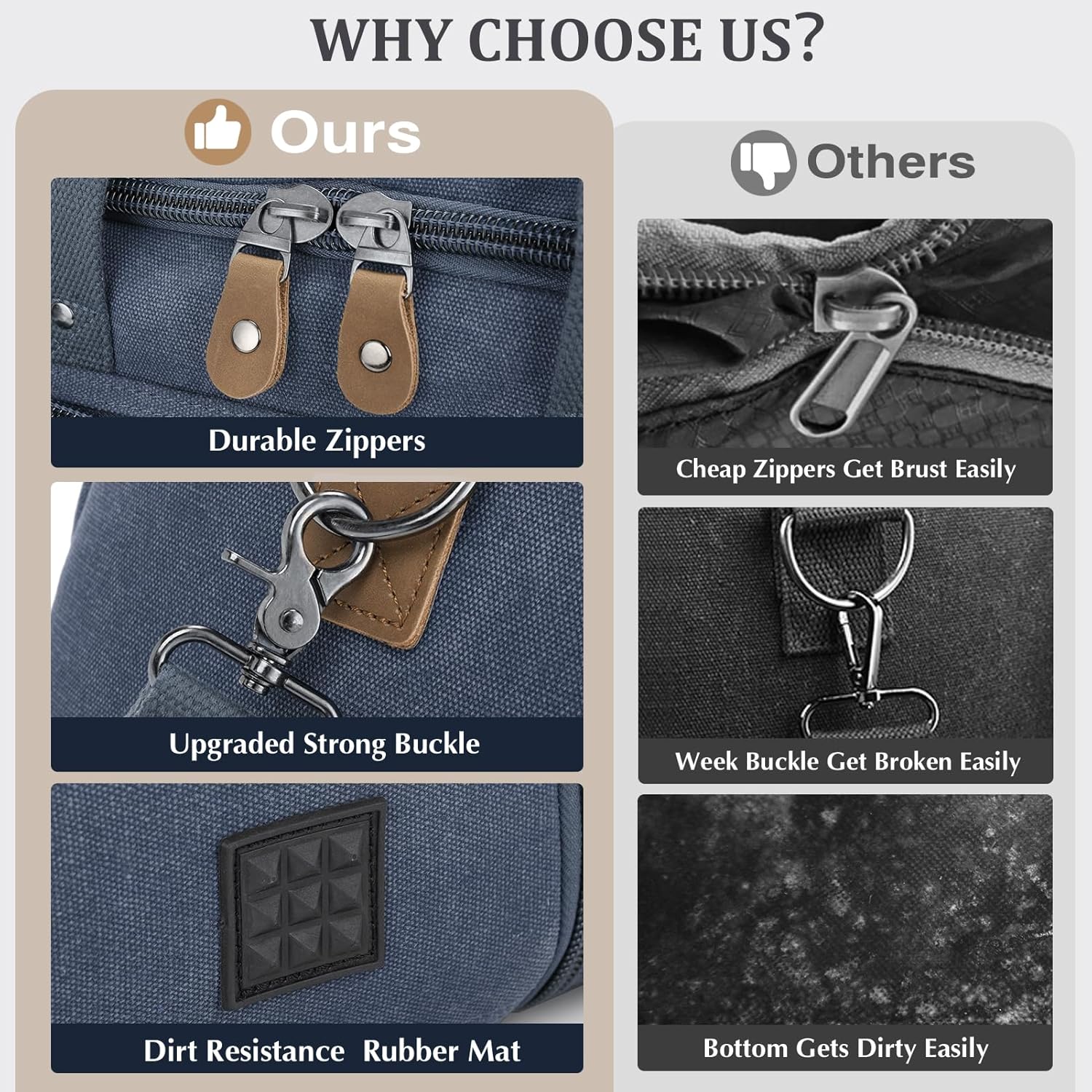 - Multipurpose: Suitable for both men and women, the Canvas Travel Duffel Bag can be used as a weekender bag, overnight bag, short-term travel bag, toiletry kit, camping bag, business bag, gym tote, carry-on luggage, or simply as an emergency bag