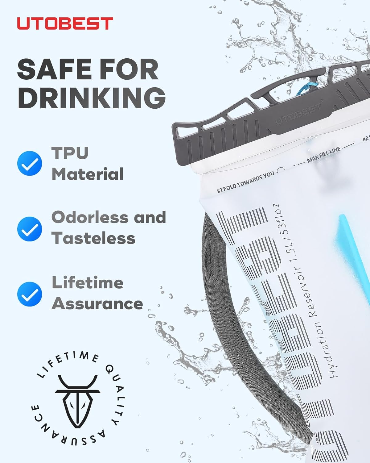 - Safe Drinking: UTOBEST 1.5L hydration bladder is made of food-grade TPU, safer and more durable than PEVA/EVA. Odorless, tasteless, and BPA-free. The soft bite valve has a protective cap to keep dirt out, ensuring safe drinking