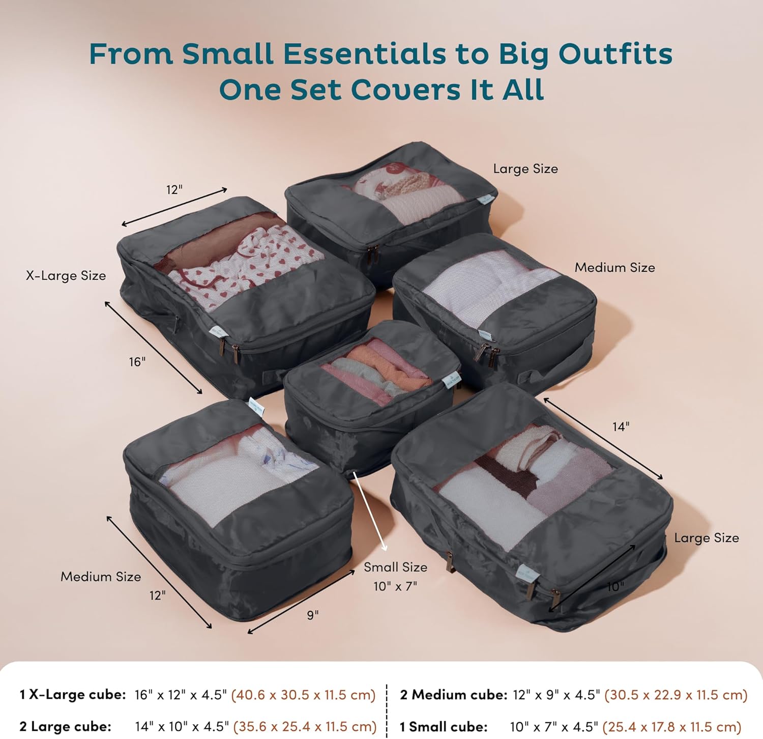- Your Ultimate Travel Organizer - 6 lightweight, compressible packing cubes in assorted sizes to maximize space and keep essentials neat. Perfect for suitcase organization, weekend getaways, long trips, or daily use.