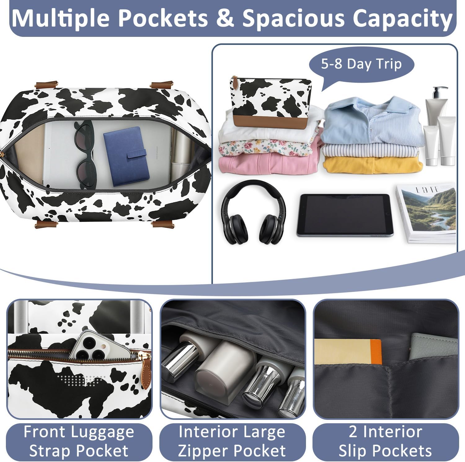 Travel Duffle Bag for Women, Weekender Bags, Hospital Bag for Labor Delivery, Lightweight Tote Duffel Overnight Bag with Luggage Sleeve, Airplane Travel Bags with Toiletry Bag, X-Large, Cow