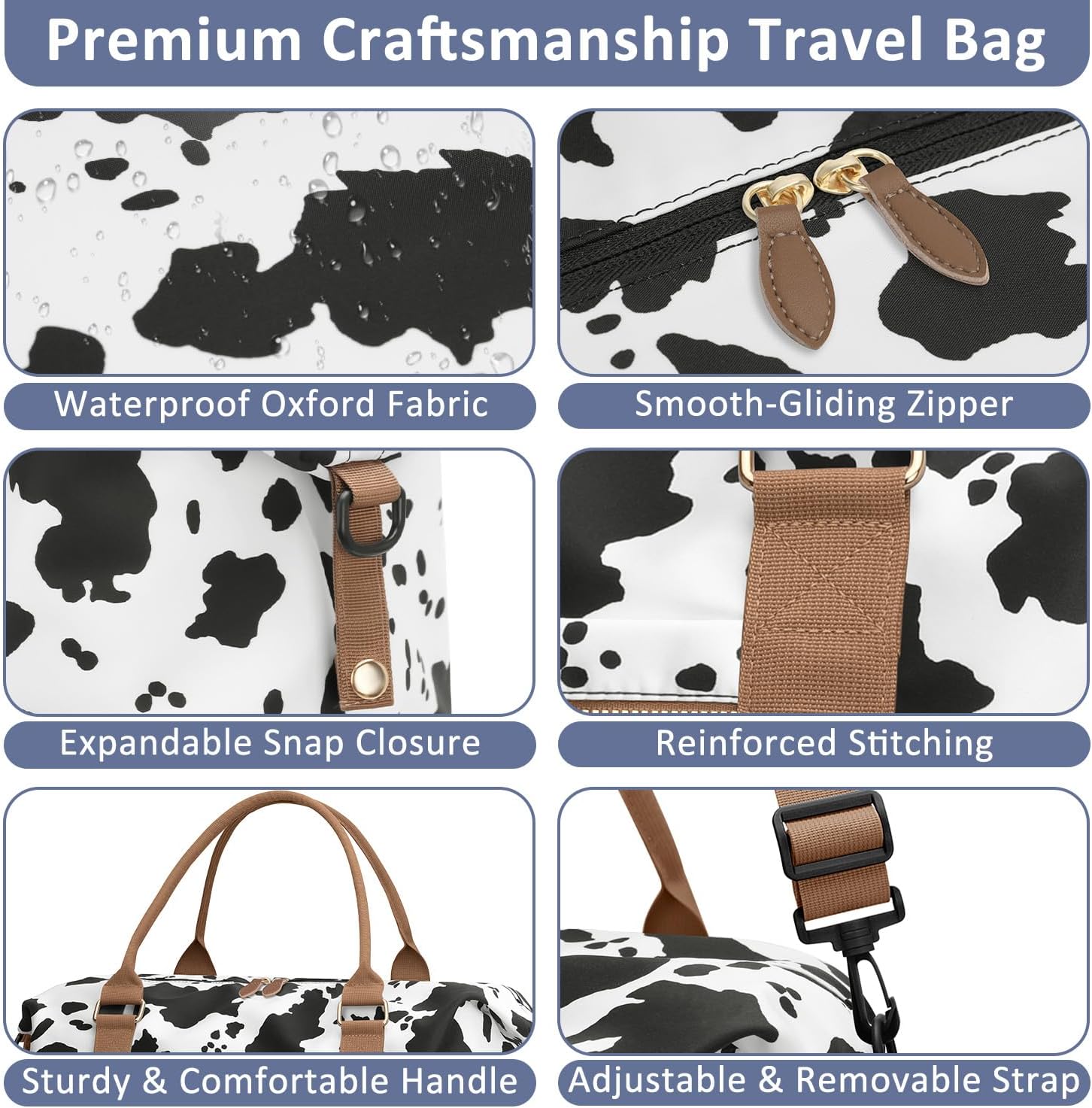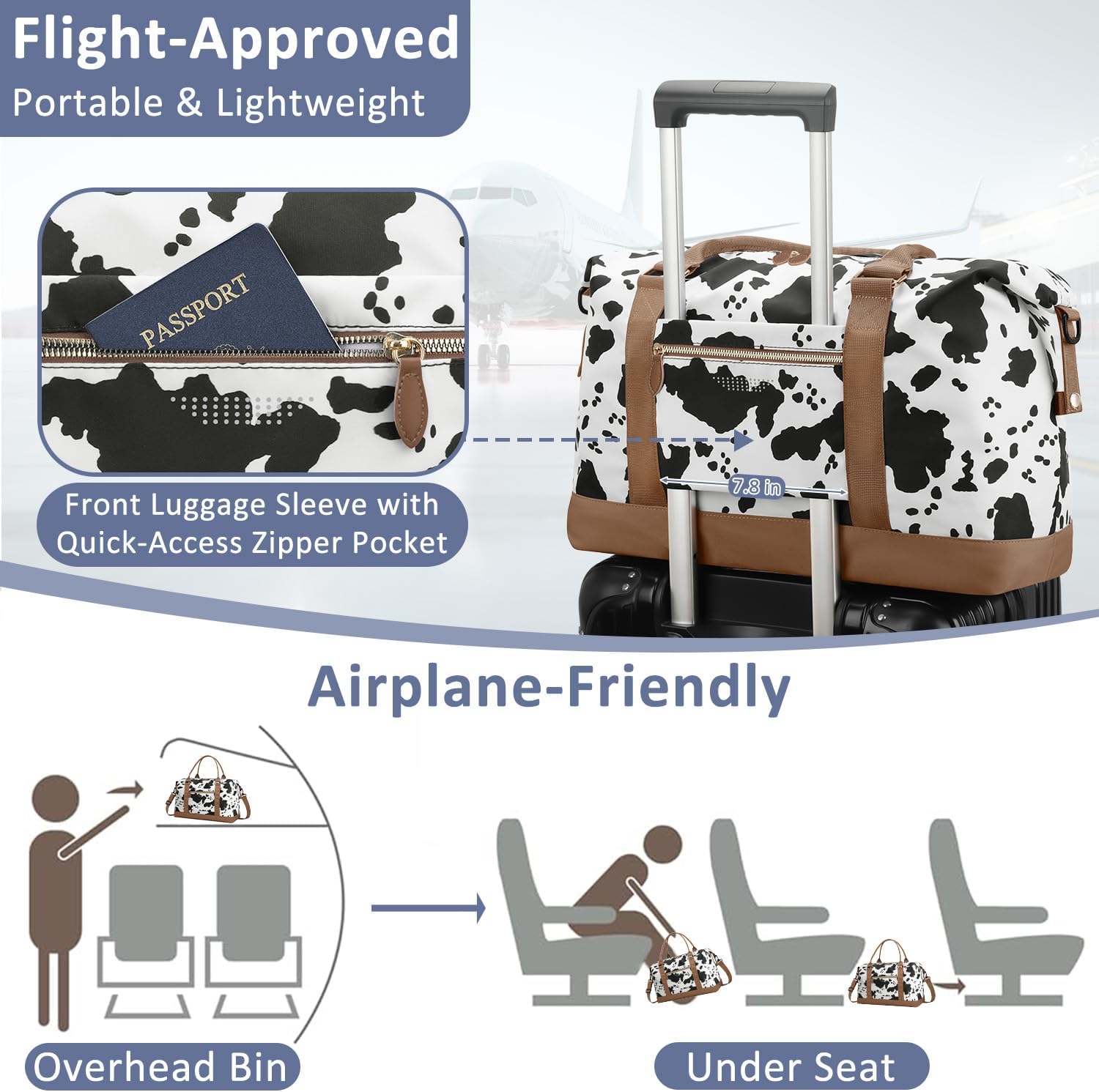 Travel Duffle Bag for Women, Weekender Bags, Hospital Bag for Labor Delivery, Lightweight Tote Duffel Overnight Bag with Luggage Sleeve, Airplane Travel Bags with Toiletry Bag, Large, Cow