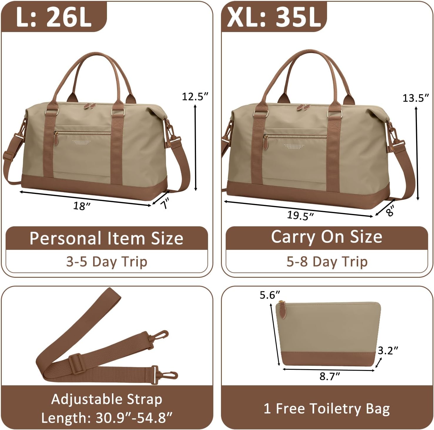 - Premium Upgraded Fabric & Free Toiletry Bag: These travel duffel bags are made of tear-resistant and water-resistant polyester Oxford material, featuring heavy-duty stitching and reinforced straps. Designed for long-term use, they have held up perfectly through multiple trips. This womens duffle bag comes with a free toiletry bag, perfect for storing cosmetics or small travel essentials, easy to help keep things better organized.