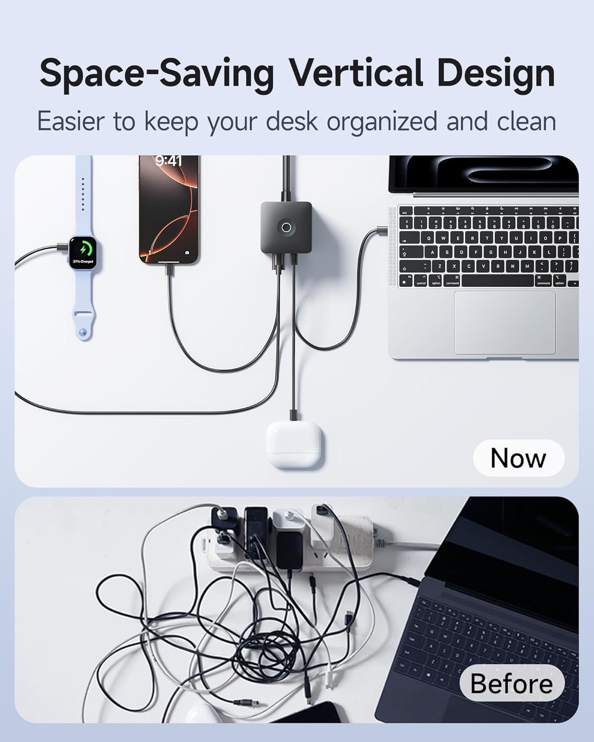 - Customized Stand Design for a Cleaner Workspace: Space-Saving Vertical Design for an Organized Workspace: The power strip stands stably at your desk without taking up too much space while charging up to 10 devices. Plug everything in it - it's easier to manage your cables.
