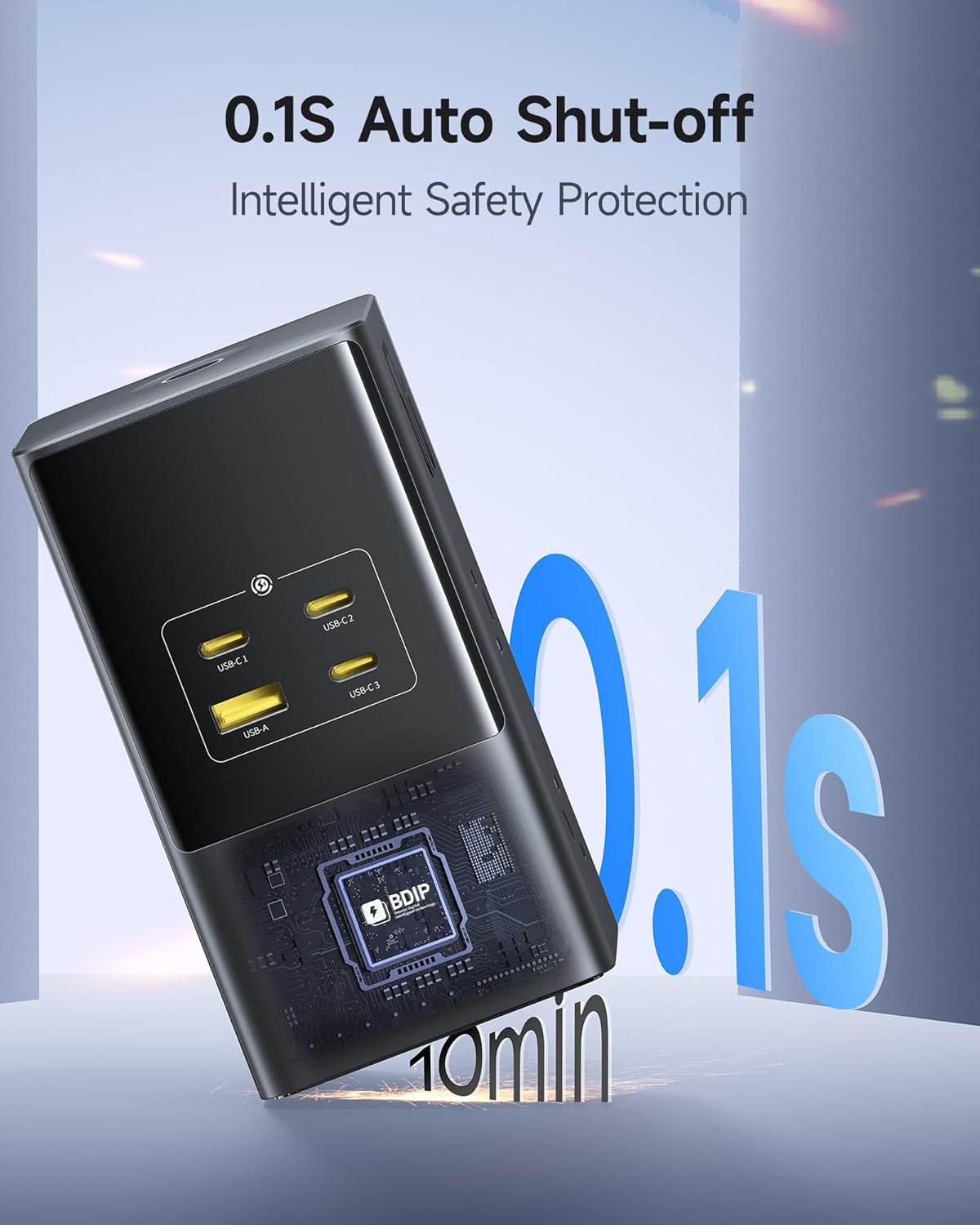 - 0.1S intelligent protection: 0.1S Intelligent Protection: When an abnormality is detected, such as overvoltage or overpower, the power strip will automatically shut off in 0.1 seconds to protect your devices and avoid possible hazards.