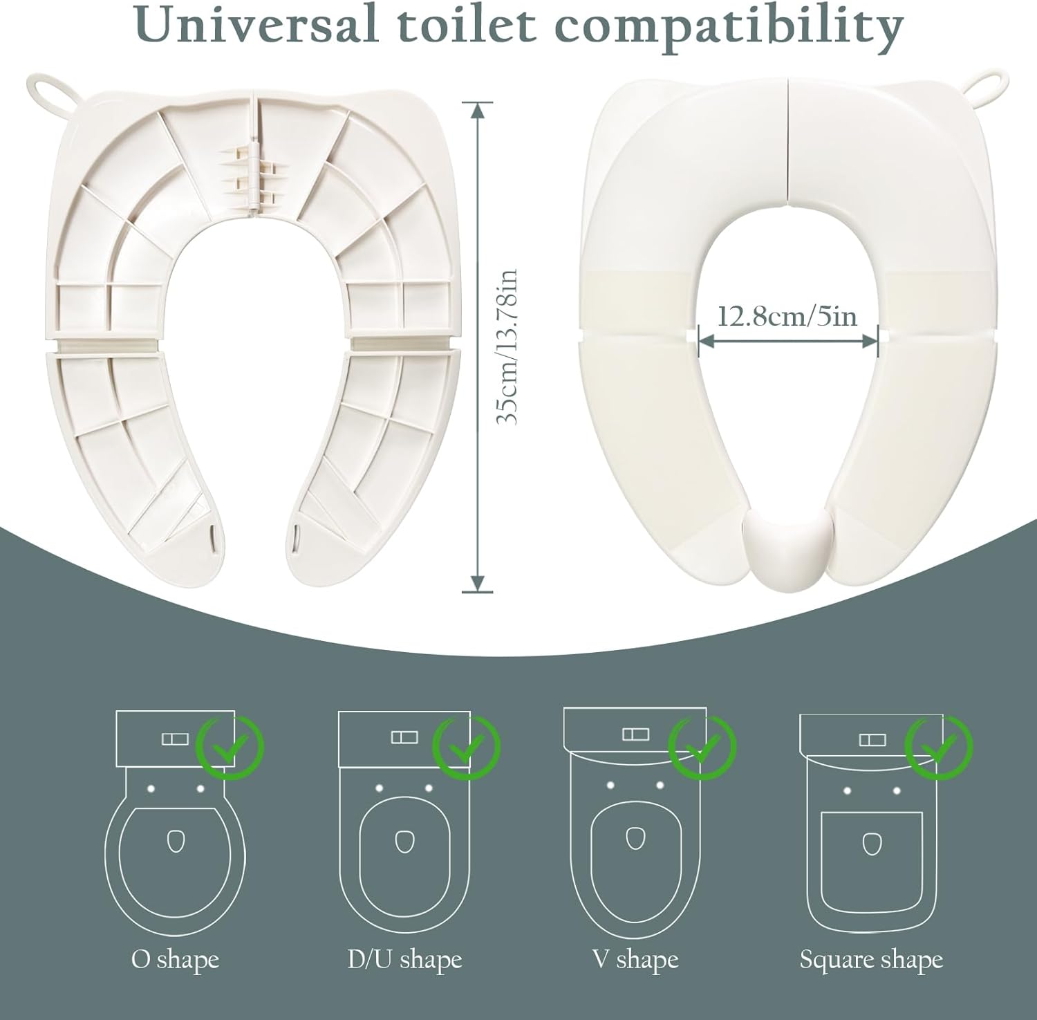 - [UNIVERSAL FIT FOR ALL TOILETS] - Designed to securely fit most standard toilets, this U-shaped seat (13.78"L x11.42"W) provides a stable base for toddlers aged 1-6, making toilet training stress-free at home or on the go.