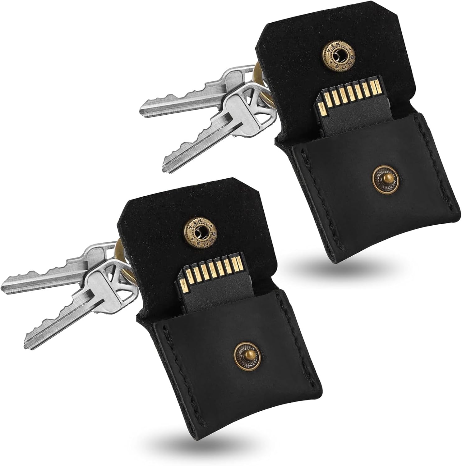 Jack&Chris Genuine Leather SD Card Holder Keychain, Anti-Shock Anti-Dust SD Card Case, Portable Camera Accessories for SD CF CFexpress Micro SD Nano SIM and Micro SIM Cards, Black 2 Packs