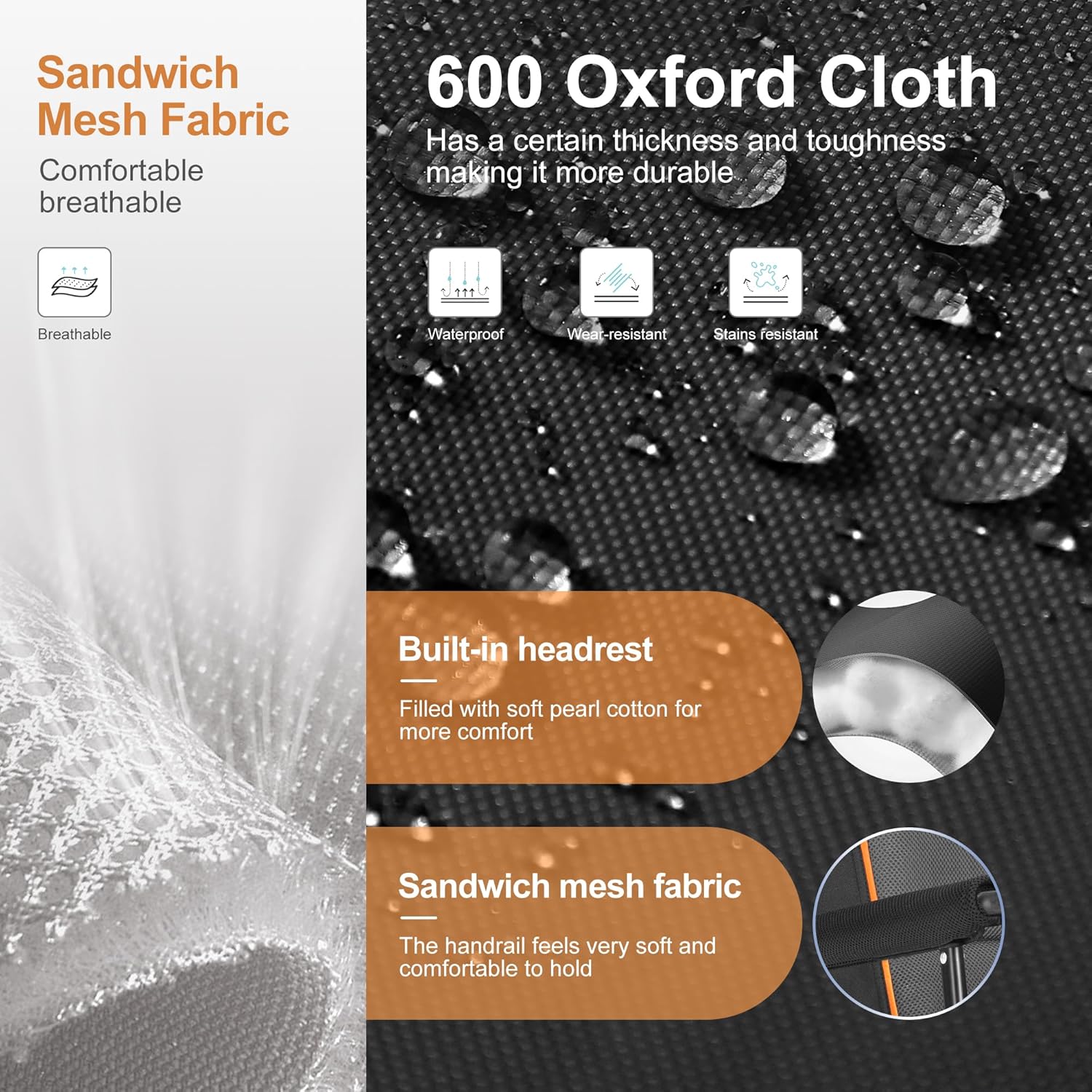 - Comfortable Design: We've added a comfy headrest that's thick and soft, so you can lean back and relax. The back and armrests are made from breathable, durable fabric with sandwich mesh padding, offering great comfort and rebound.