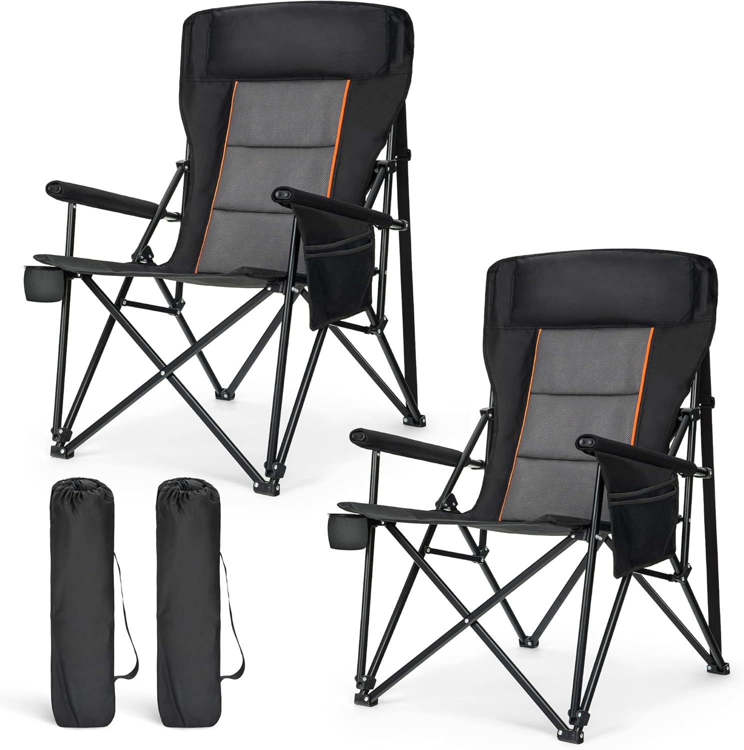 LET'S CAMP Oversized Camping Chairs 29.52" High Back Heavy Duty Lawn Chair Support 500LBS, Portable Collapsible Chair with Cup Holder, Side Pocket,2 Pack(Black)