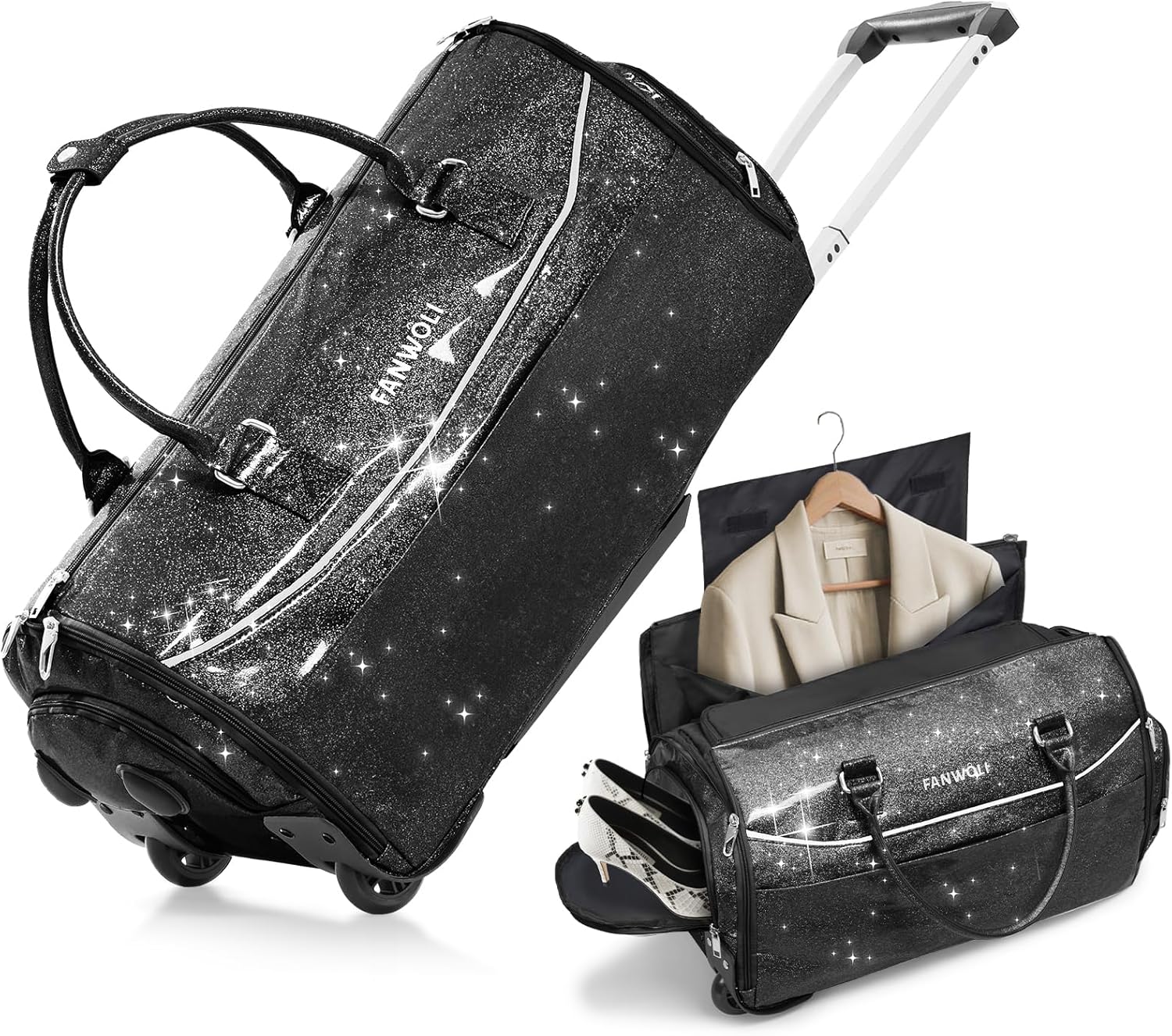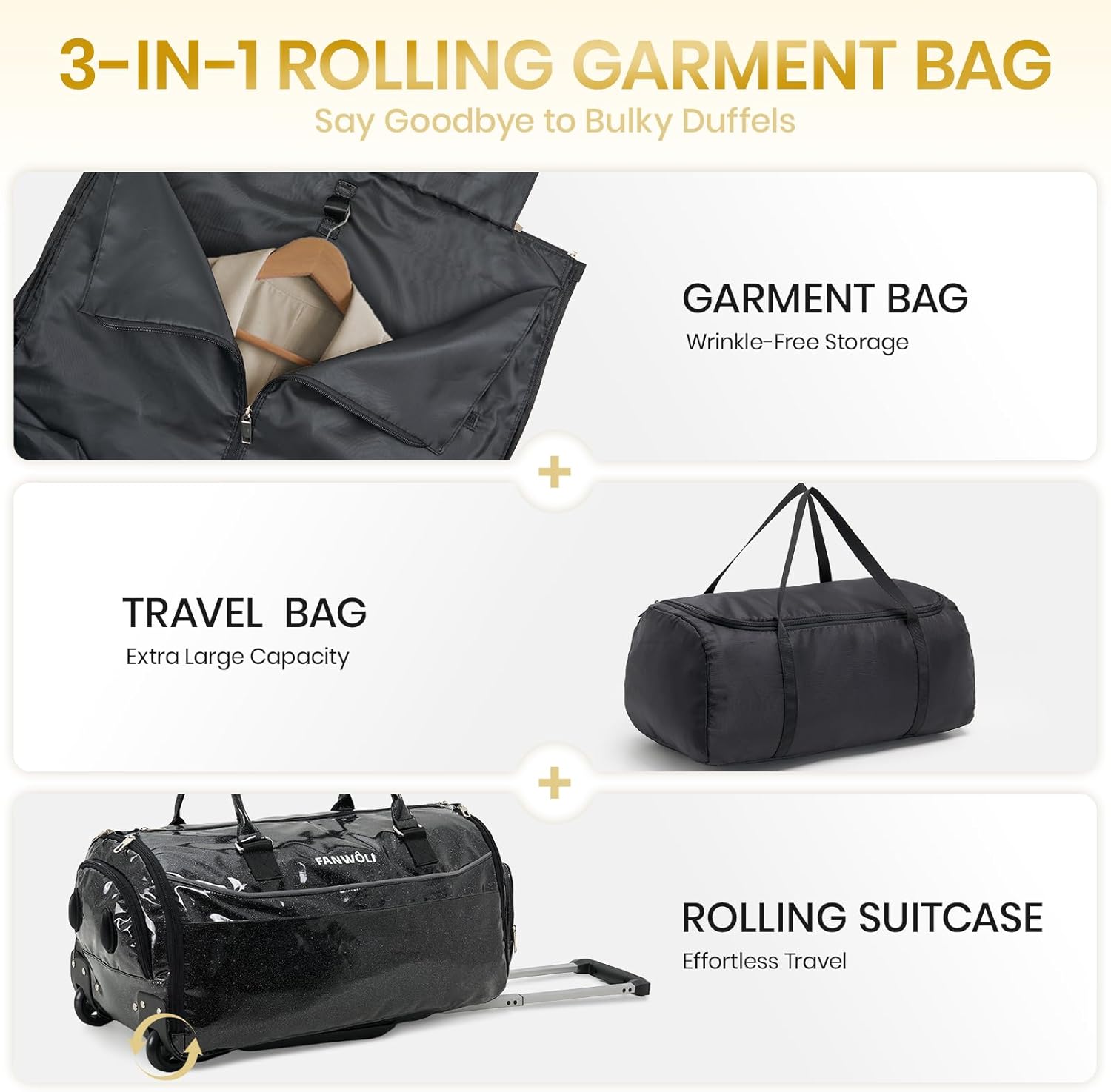 - 【SAY GOODBYE TO BULKY DUFFELS! 】The Fanwoli 3-in-1 Rolling Garment Bag merges a garment bag, travel bag, and wheeled trolley. It keeps suits wrinkle-free like traditional garment bags but adds high-capacity storage and smooth-rolling wheels for effortless travel. Perfect for business trips, travel , weddings, or weekends—all your travel needs solved in one sleek bag!