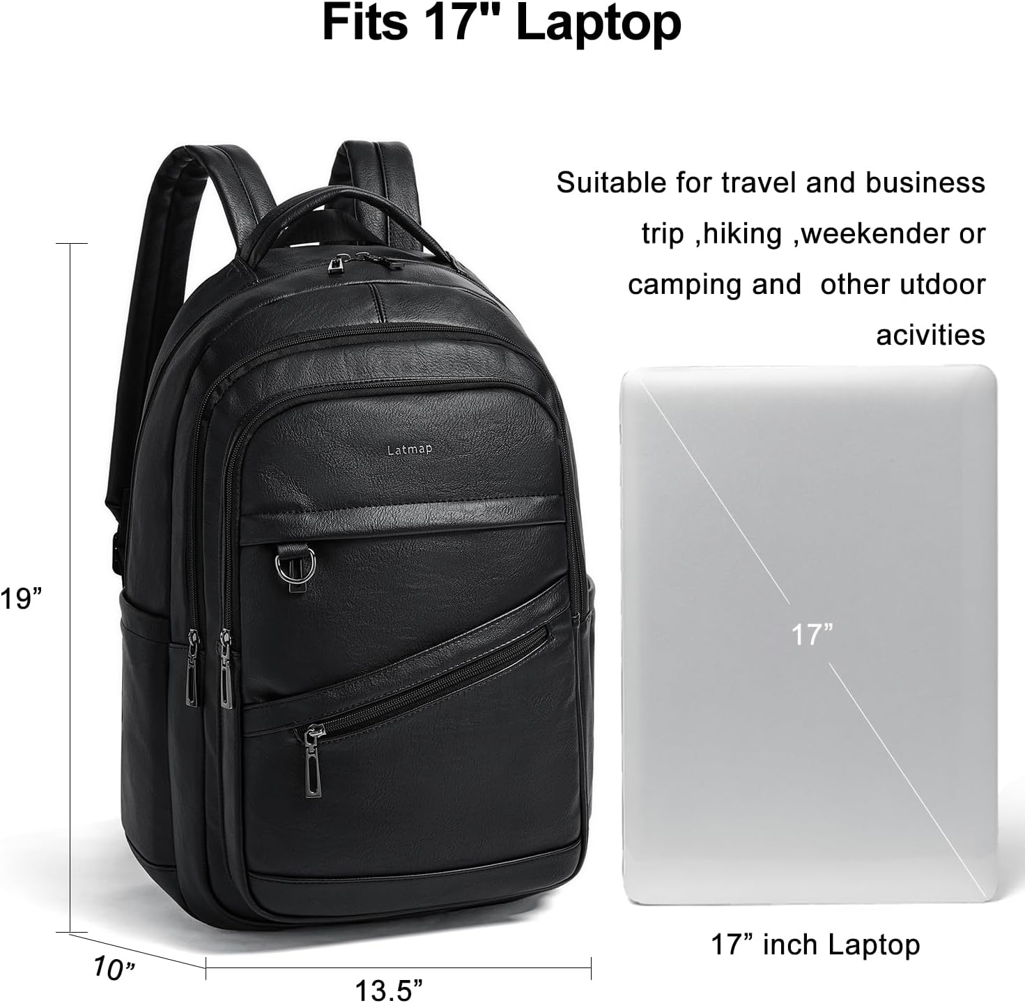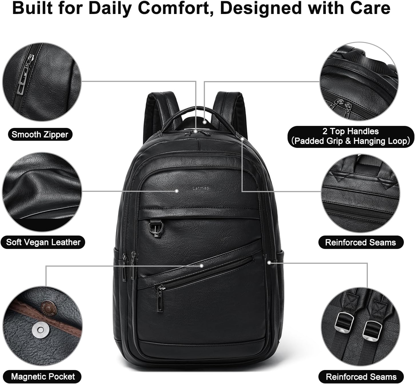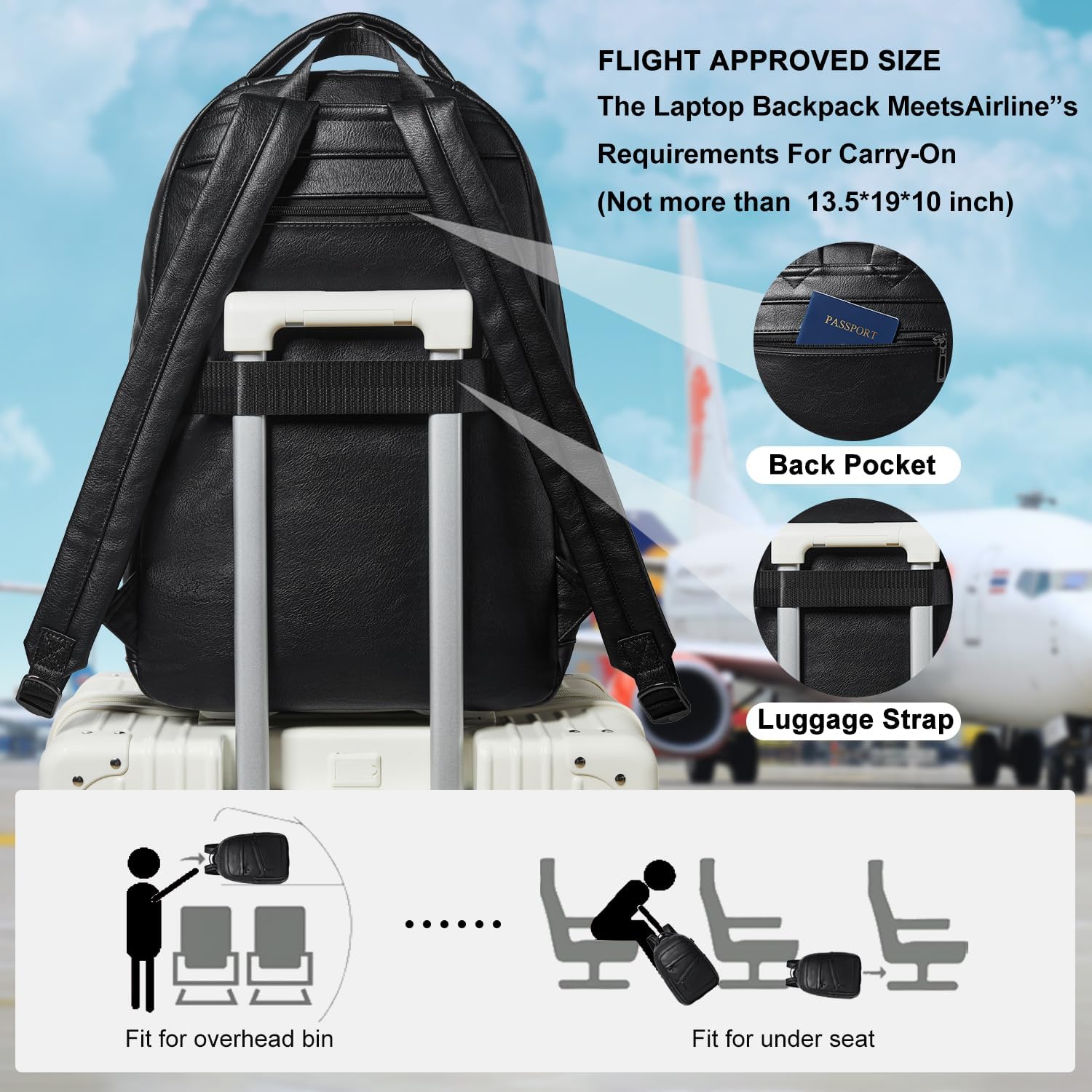 43L Backpack for Women Men - Vegan Leather Backpack Purse Travel Carry-on Bag College Bookbag Work fits 17" Laptop, Black