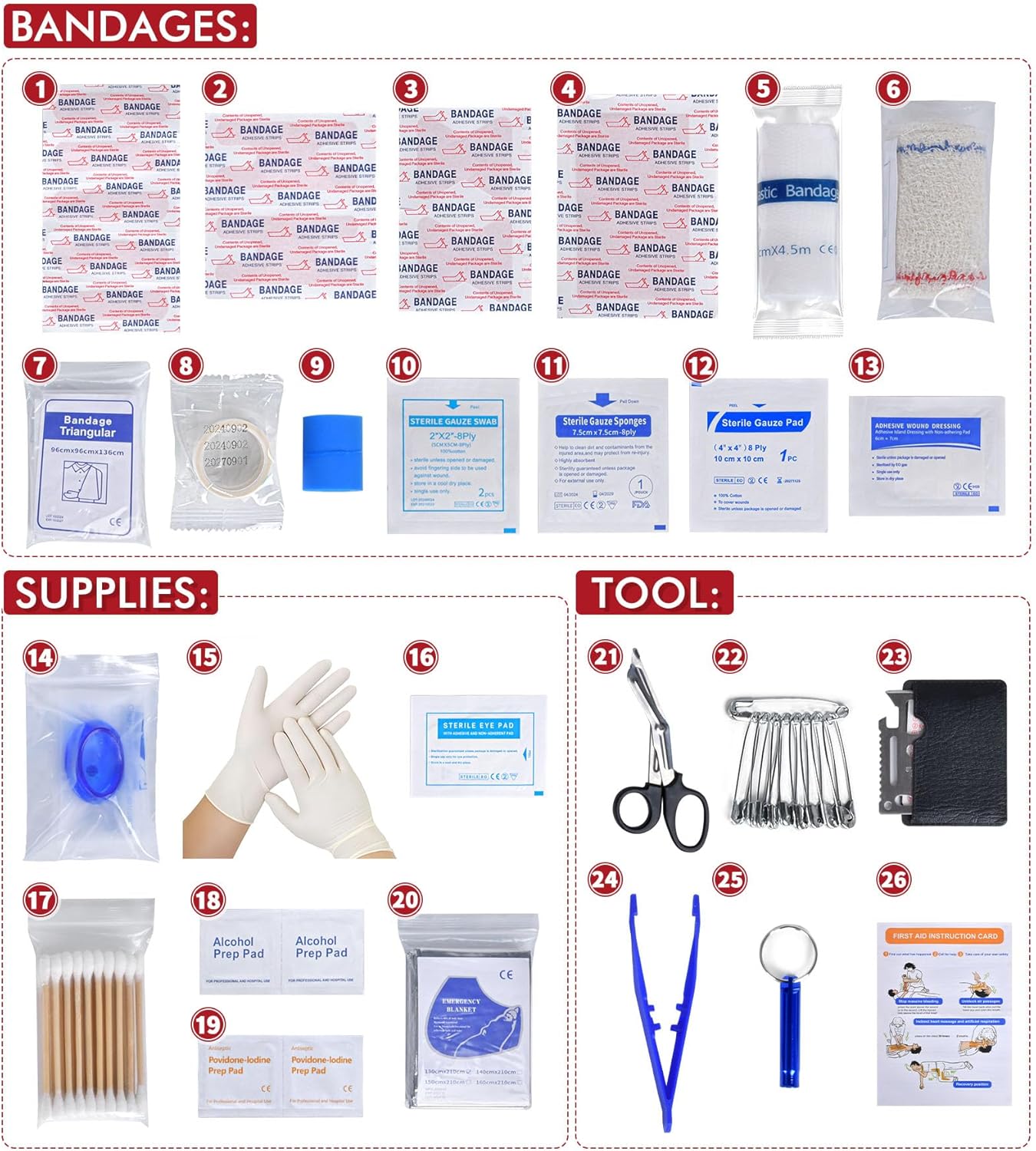 - 【ESSENTIALS FOR EMERGENCY】This amazing first aid kit allows you to feel safe and confident 24/7! Our travel first aid kit includes a premium selection of emergency-preparedness supplies, is a great ideal for families, offices, camping, hiking, boating, cars, sports, travel, road trips, the workplace, and schools. Anyone who wants to be prepared for any situation should choose this medical kit.