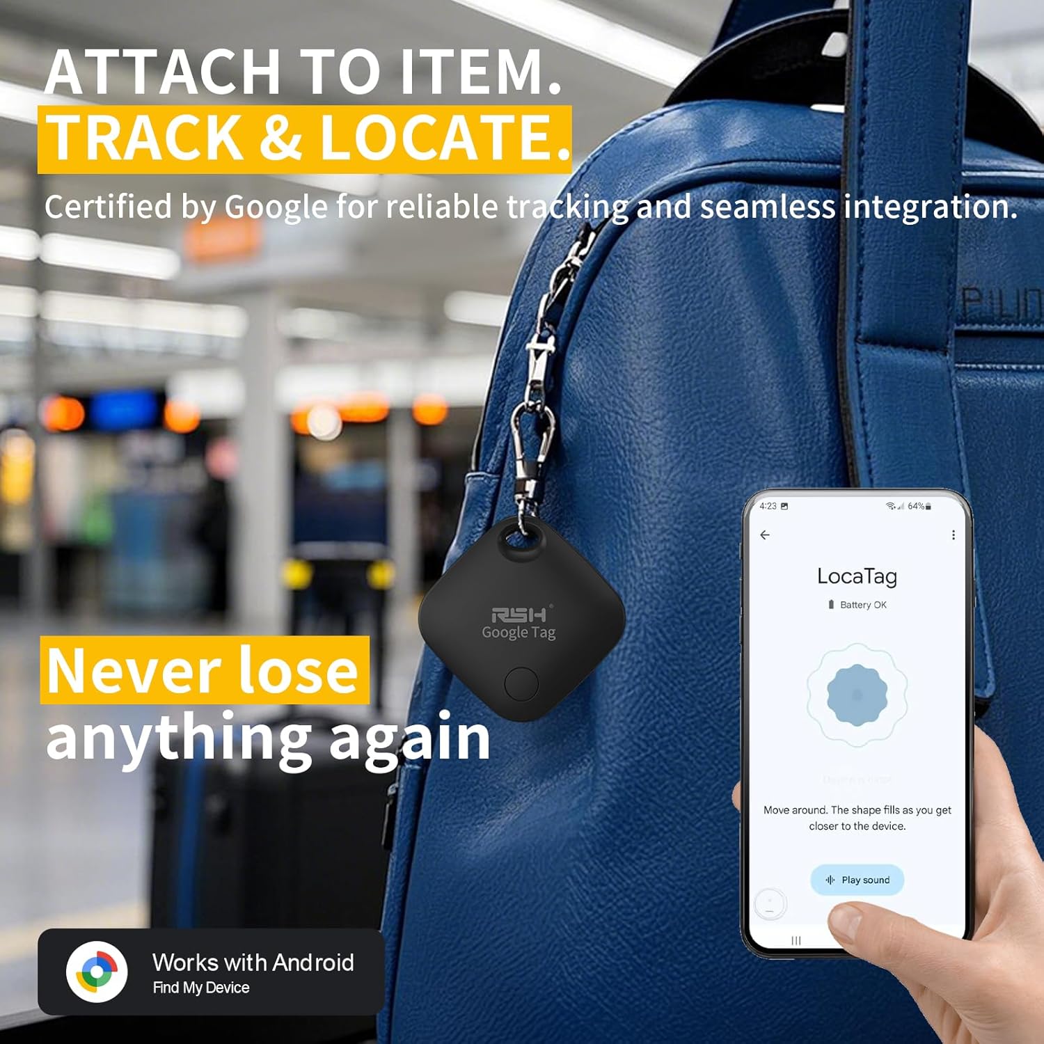 - Find Nearby Tracker Tag With Sound: Within Bluetooth range (up to 60 m/200ft), you can check the location and easily find your item by activating sound via Google Find Hub/ Find My app or voice commands. The Android tracking tag will ring loud enough to help you locate it.