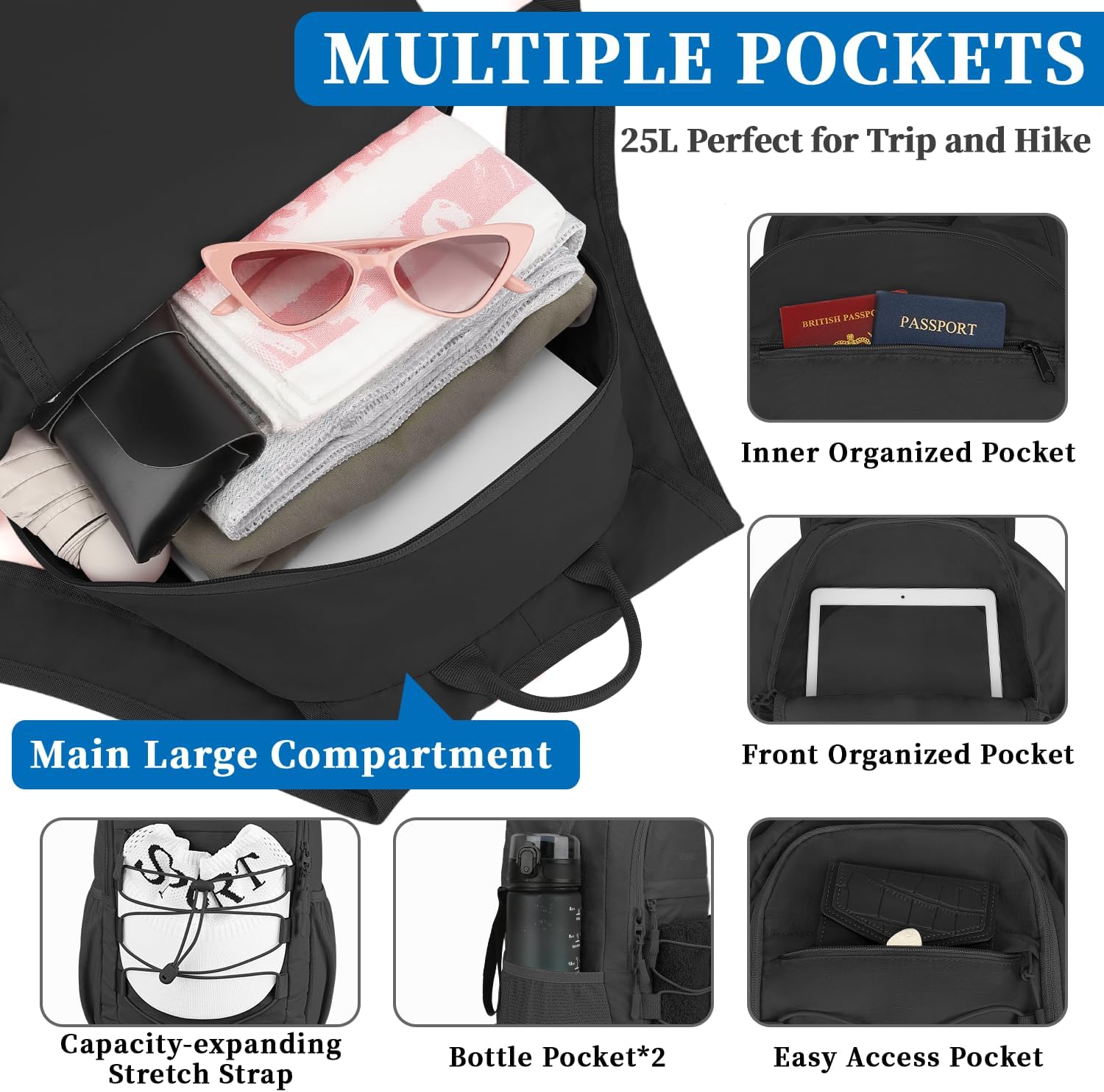 - Compact Yet Spacious: This hiking backpack for women combines minimal size with maximum practicality. The 25l main compartment and zippered interior pocket can hold your travel and hiking essentials. Two quick-access front zippered pockets hold your phone, portable charger and more. Two side pockets can easily accommodate large water bottles and umbrellas. An elastic drawstring stores items such as hats or sports protective gear