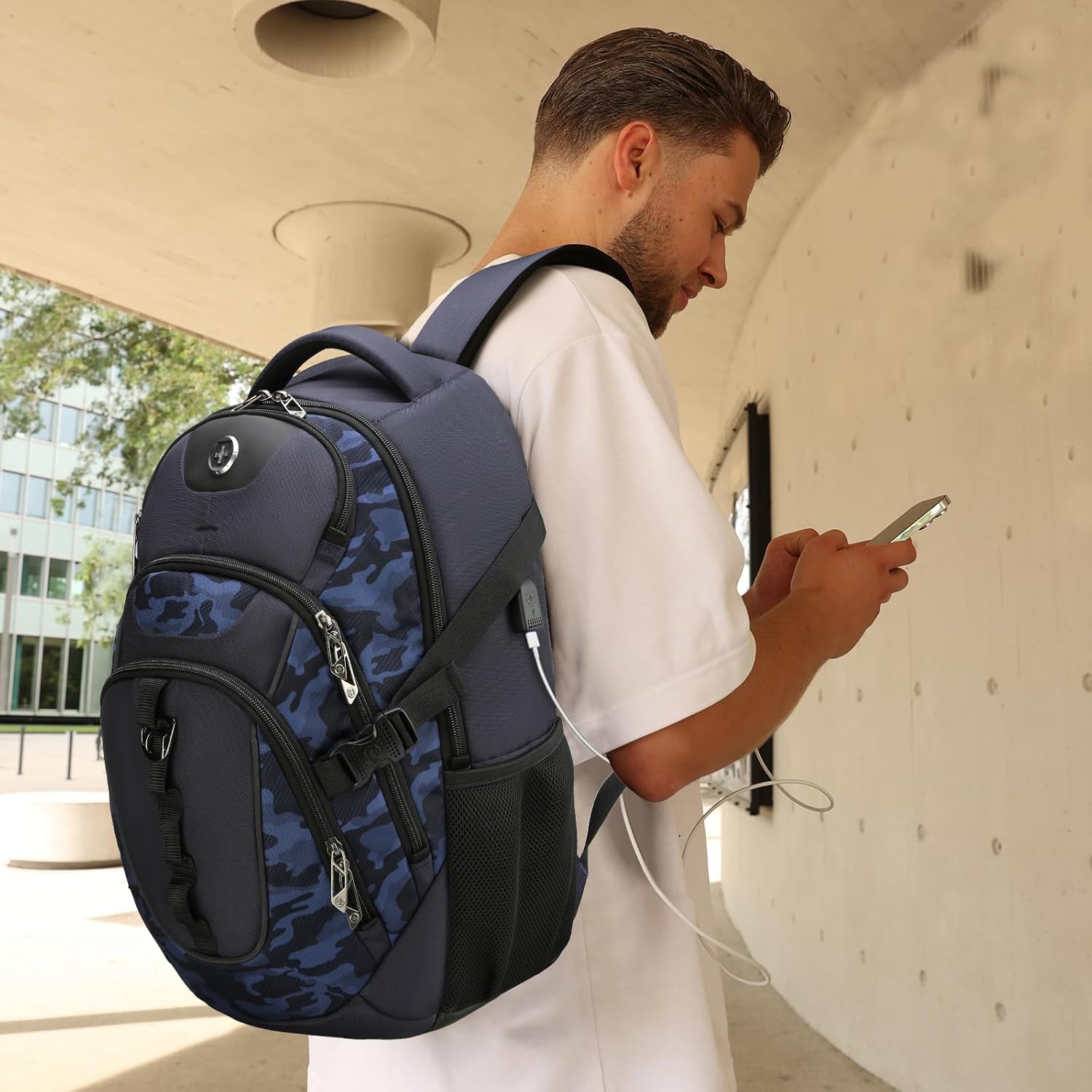 Swissdigital Design Laptop Backpack with USB Charging Port, TSA Travel Backpack Fits 15.6 inches Computer, 31L College School Backpack for Men, Blue Camo | SD803